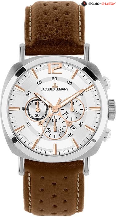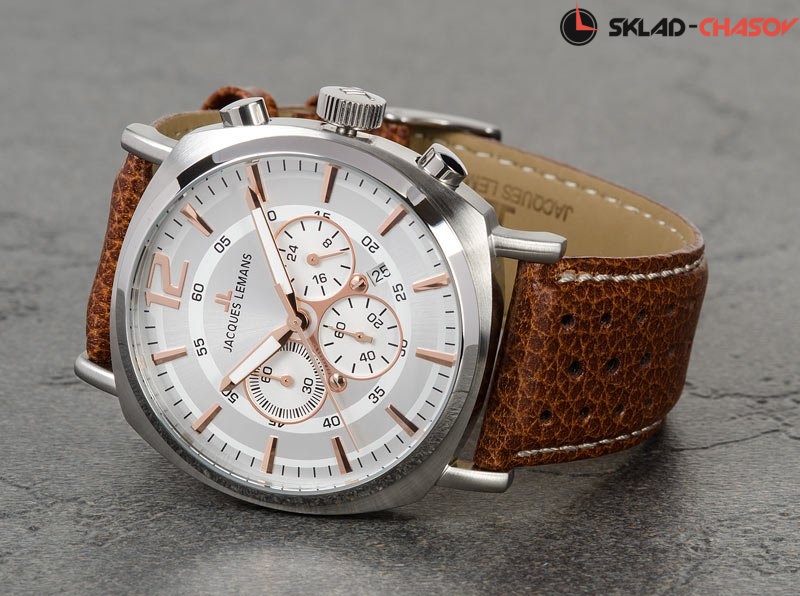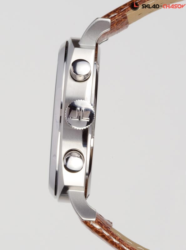 Точный кварцевый механизм хронографа. Смещенная секундная стрелка. Окошко даты. • Точность хода не хуже -10 +15 сек./в месяц. • Минеральное стекло устойчивое к возникновению царапин. • Корпус из высококачественного стального сплава 316L с высокими антикоррозийными свойствами. • Водозащита до 10 АТМ. • Кожаный ремешок. Размер корпуса: диаметр 46 мм