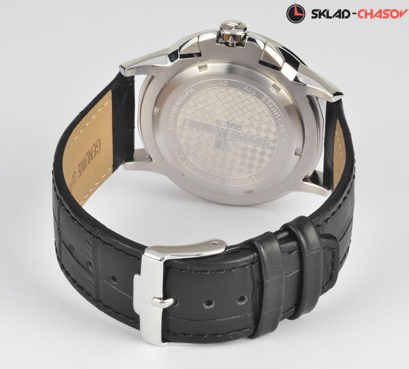• Японский кварцевый механизм с аналоговой индикацией. • Точность хода с погрешностью не более -/+20 сек. в месяц. • Центральные часовая, минутная и секундная стрелки. • Индикация даты. • Индикатор времени суток в 24-часовом формате. • Хронограф с маленькой секундной стрелкой и 30-минутным индикатором. • Корпус выполнен из нержавеющей стали 316L, поверхности с матовой шлифовкой (сатинирование) и полировкой до зеркального блеска. • Диаметр корпуса составляет 42 мм. • Выступы корпуса защищают переводную коронку от случайных ударов. • Фирменное стекло Crystex сочетает твердость сапфира со стойкостью к ударному воздействию минерального стекла. • Циферблат со стилизацией под гильоширование, аппликация часовых меток и окантовки доп. индикаторов. Увеличенная, закругленная апертура даты на отметке «12 часов». • Задняя крышка имеет винтовое соединение с корпусом. • Водостойкость 100 метров (10 АТМ). • Кожаный ремешок с тиснением и прошивкой, стандартная застежка с шипом.