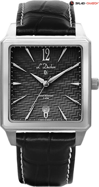 Мужские кварцевые часы выполнены в квадратном корпусе из высоколегированной нержавеющей стали 316L. Модель выглядит солидно и представительно благодаря черному циферблату, который декорирован гильоше в виде необычной сетчатой структуры. Указатель даты расположен на уровне шести часов и элегантно украшен стальной окантовкой. Индексы в форме пирамидок создают эффект игры света, а мечеобразные стрелки смотрятся объемными и хорошо читаемыми. Циферблат защищен сапфировым стеклом выпуклой формы, что более сложно в исполнении.
