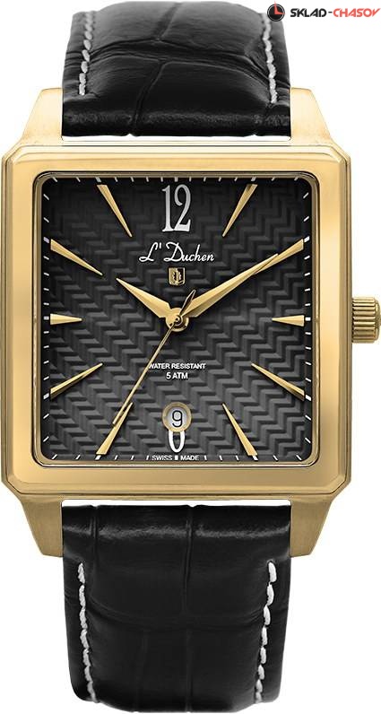 Мужские кварцевые часы выполнены в квадратном корпусе из высоколегированной нержавеющей стали 316L с PVD-покрытием из желтого золота. Модель выглядит солидно и представительно благодаря черному циферблату, который декорирован гильоше в виде необычной сетчатой структуры. Указатель даты расположен на уровне шести часов и элегантно украшен стальной окантовкой. Индексы в форме пирамидок создают эффект игры света, а мечеобразные стрелки смотрятся объемными и хорошо читаемыми. Циферблат защищен сапфировым стеклом выпуклой формы, что более сложно в исполнении.