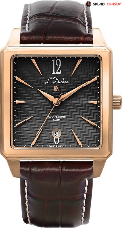 Мужские кварцевые часы выполнены в квадратном корпусе из высоколегированной нержавеющей стали 316L с PVD-покрытием из розового золота. Модель выглядит солидно и представительно благодаря черному циферблату, который декорирован гильоше в виде необычной сетчатой структуры. Указатель даты расположен на уровне шести часов и элегантно украшен стальной окантовкой. Индексы в форме пирамидок создают эффект игры света, а мечеобразные стрелки смотрятся объемными и хорошо читаемыми. Циферблат защищен сапфировым стеклом выпуклой формы, что более сложно в исполнении.