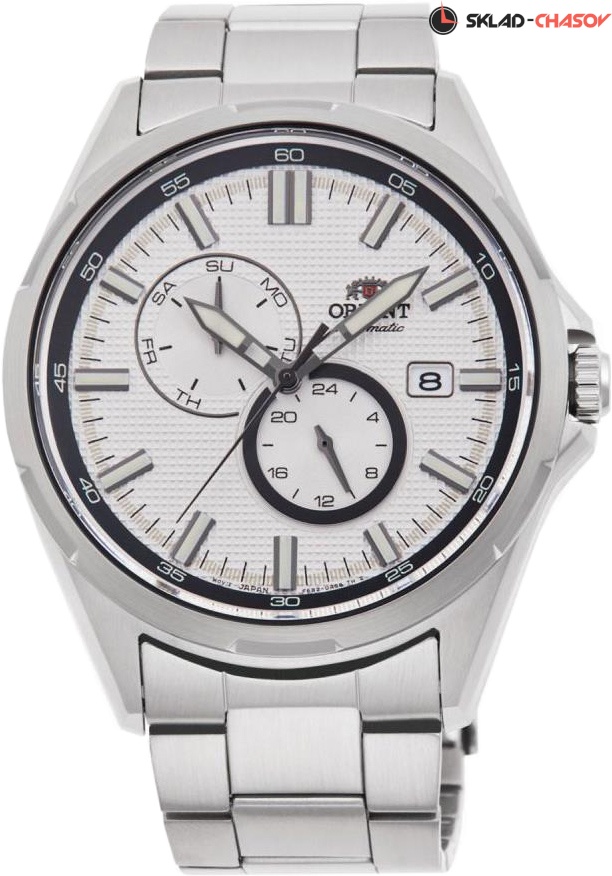Sporty. Циферблат с окошком даты. День недели отображается на отдельном циферблате. 12-ти и 24-х часовой формат времени. В механизме 22 камня, частота 21600 полуколебаний в час. Запас хода 40 часов. Возможность ручного завода. Завинчивающаяся задняя крышка. Заводная головка с защитой. Браслет с раскладывающейся застежкой.