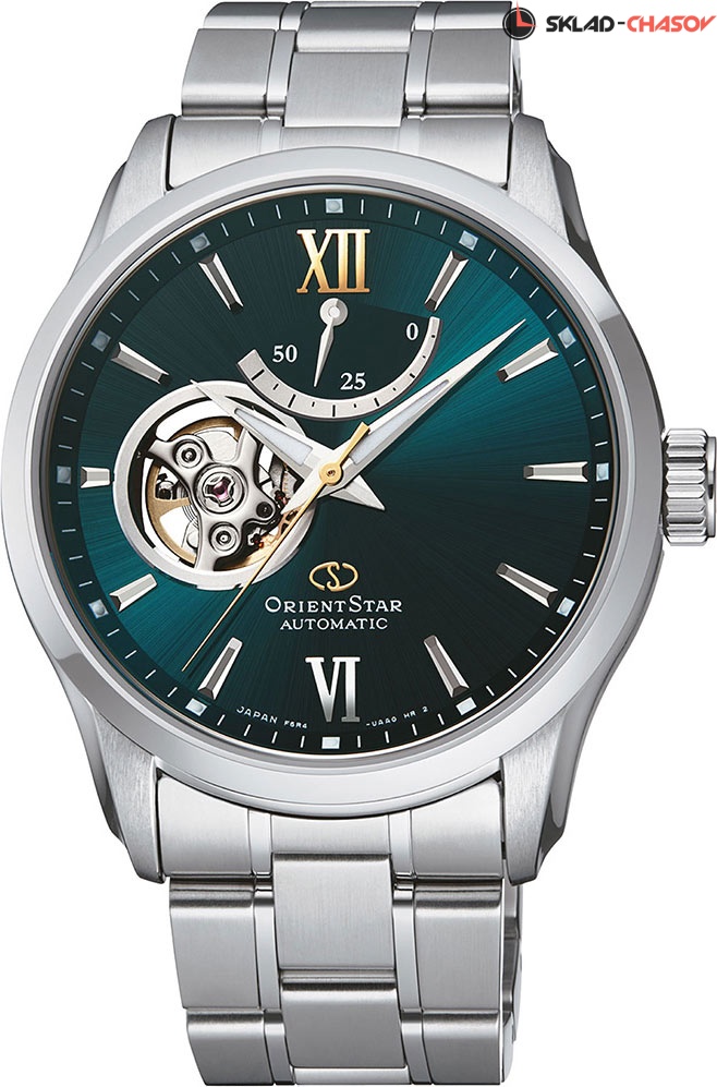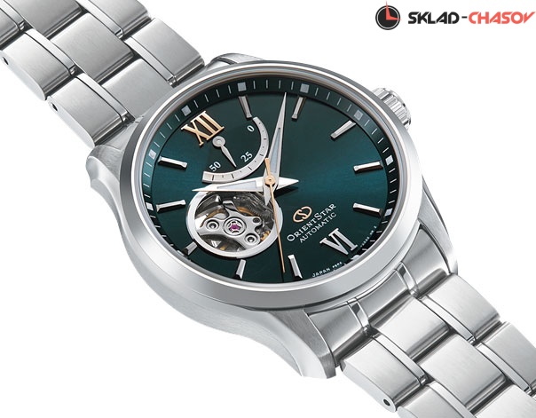 Orient Star. Сквозь прозрачное окошко на циферблате можно наблюдать за работой механизма часов. Возможность ручного завода. Ретроградный указатель запаса хода до 50 часов. Завинчивающаяся прозрачная задняя крышка.