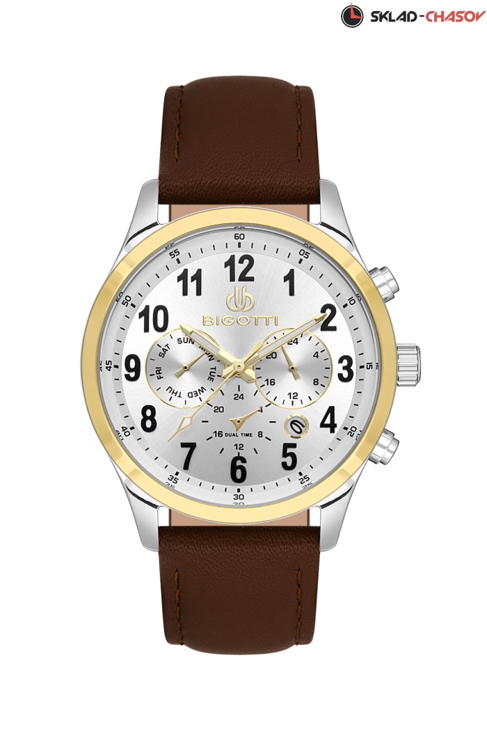 Стильные мужские часы с мультифункцией из коллекции Quotidiano. Корпус выполнен из латуни с IP-покрытием. Циферблат выполнен по технологии Sunray (солнечный луч). Часовая, минутная и секундная стрелки с люминесцентным покрытием. Рифленая заводная головка. Ремешок из натуральной кожи с классической застежкой. Дополнительные функции: дата, день недели, 24-часовой формат времени, 2 часовых пояса.