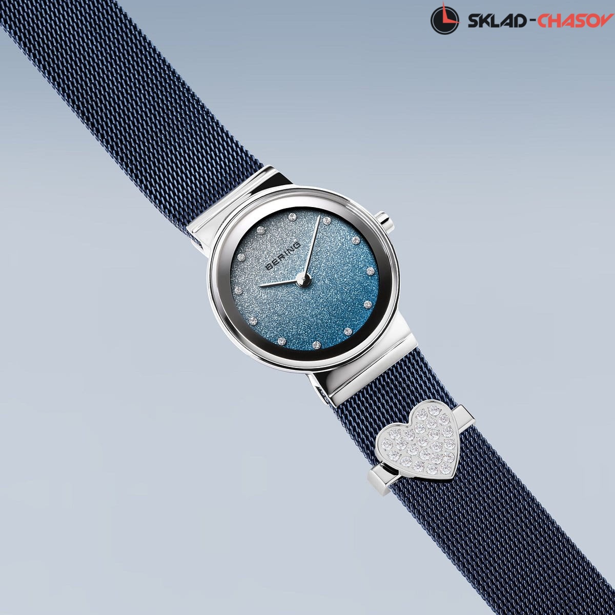 Циферблат с переходом цвета от серебристого до синего с эффектом звездная пыль и кристалами SWAROVSKI.