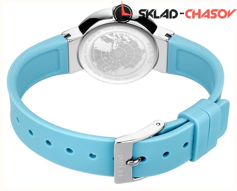 Характеристики модели 10129-708: эта модель имеет синий циферблат с солнечными лучами и двенадцатью кристальными индексами. На циферблате также имеются серебряные часовая и минутная стрелки.. полированный корпус из нержавеющей стали обрамляет циферблат. диаметр корпуса составляет 29 мм, а глубина — 6 мм. часы крепятся с помощью синего силиконового ремешка, который застегивается на пряжку. часы оснащены кварцевым механизмом. данная модель устойчива к брызгам и не должна погружаться в воду.