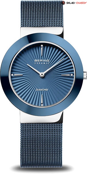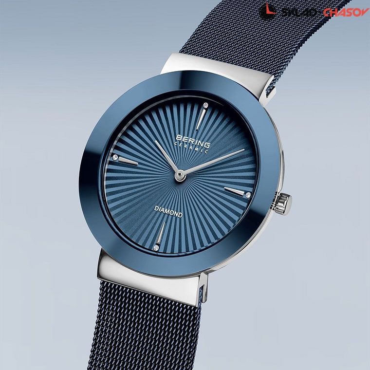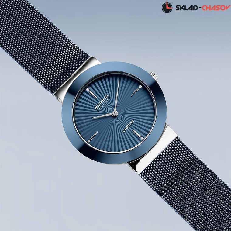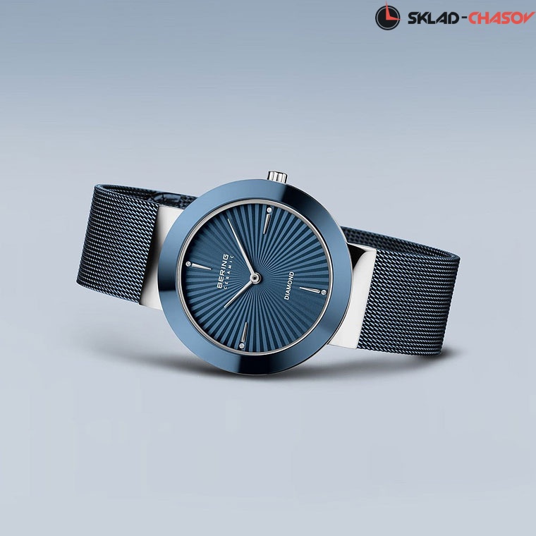 Синий циферблат с гильоширование в виде солнечныйх лучей и кристаллами.