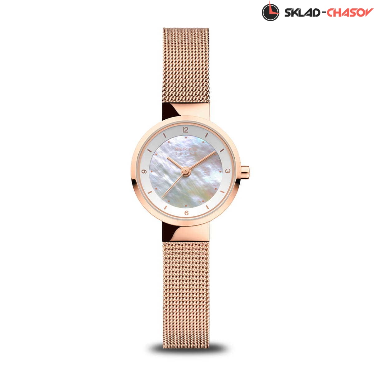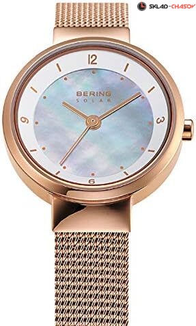 Женские кварцевые аналоговые наручные часы на солнечной батарее. Slim Solar Collection. Центральные часовая, минутная и секундная стрелки. Белый перламутровый циферблат с часовыми метками в виде штрихов и четырёх арабских цифр. Питание от солнечной энергии - источником питания служит светочувствительная панель и аккумулятор, заряжаемый при попадании солнечного света на циферблат часов. Запас хода при полностью заряженной батарее от 6 до 12 месяцев. Круглый стальной корпус с покрытием цвета розового золота. Диаметр корпуса 24 мм, толщина 7 мм. Устойчивое к возникновению мелких царапин плоское сапфировое стекло. Стальной браслет миланского плетения с покрытием цвета розового золота. Ширина браслета 10 мм. Водонепроницаемость WR 50 (мытьё рук, дождь).