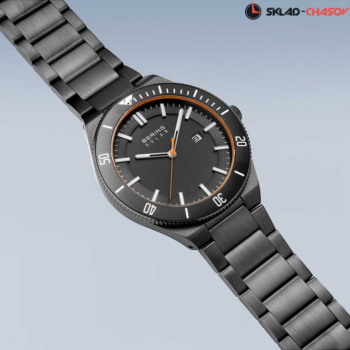 Мужские кварцевые аналоговые наручные часы на солнечной батарее. Slim Solar Collection. Центральные часовая, минутная и секундная стрелки. Серый циферблат с часовыми метками в виде штрихов. Стрелки и метки с люминесцентным покрытием, которое светится в темноте после непродолжительного воздействия света. Окошко даты в позиции 3 ч. Питание от солнечной энергии - источником питания служит светочувствительная панель и аккумулятор, заряжаемый при попадании солнечного света на циферблат часов. Запас хода при полностью заряженной батарее от 6 до 12 месяцев. Круглый стальной корпус с покрытием серого цвета. Диаметр корпуса 43 мм, толщина 10 мм. Рифлёный безель с минутной шкалой. Устойчивое к возникновению мелких царапин плоское сапфировое стекло. Стальной браслет с покрытием серого цвета. Ширина браслета 22 мм. Водонепроницаемость WR 100 (плавание без акваланга).
