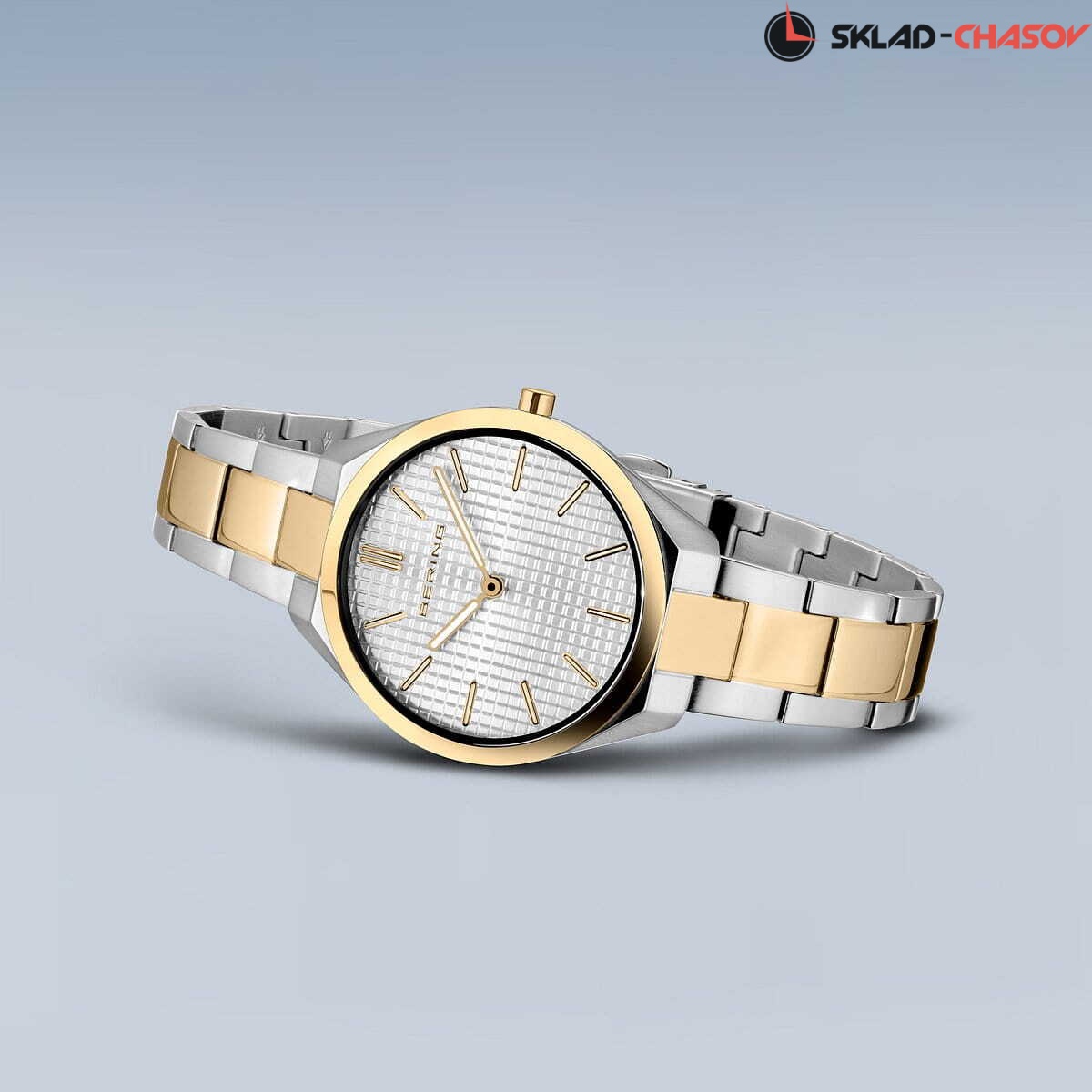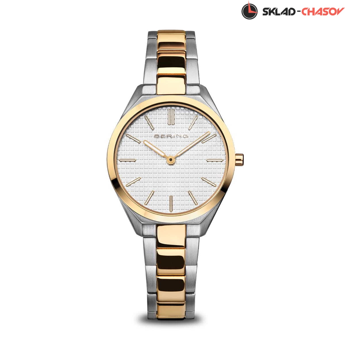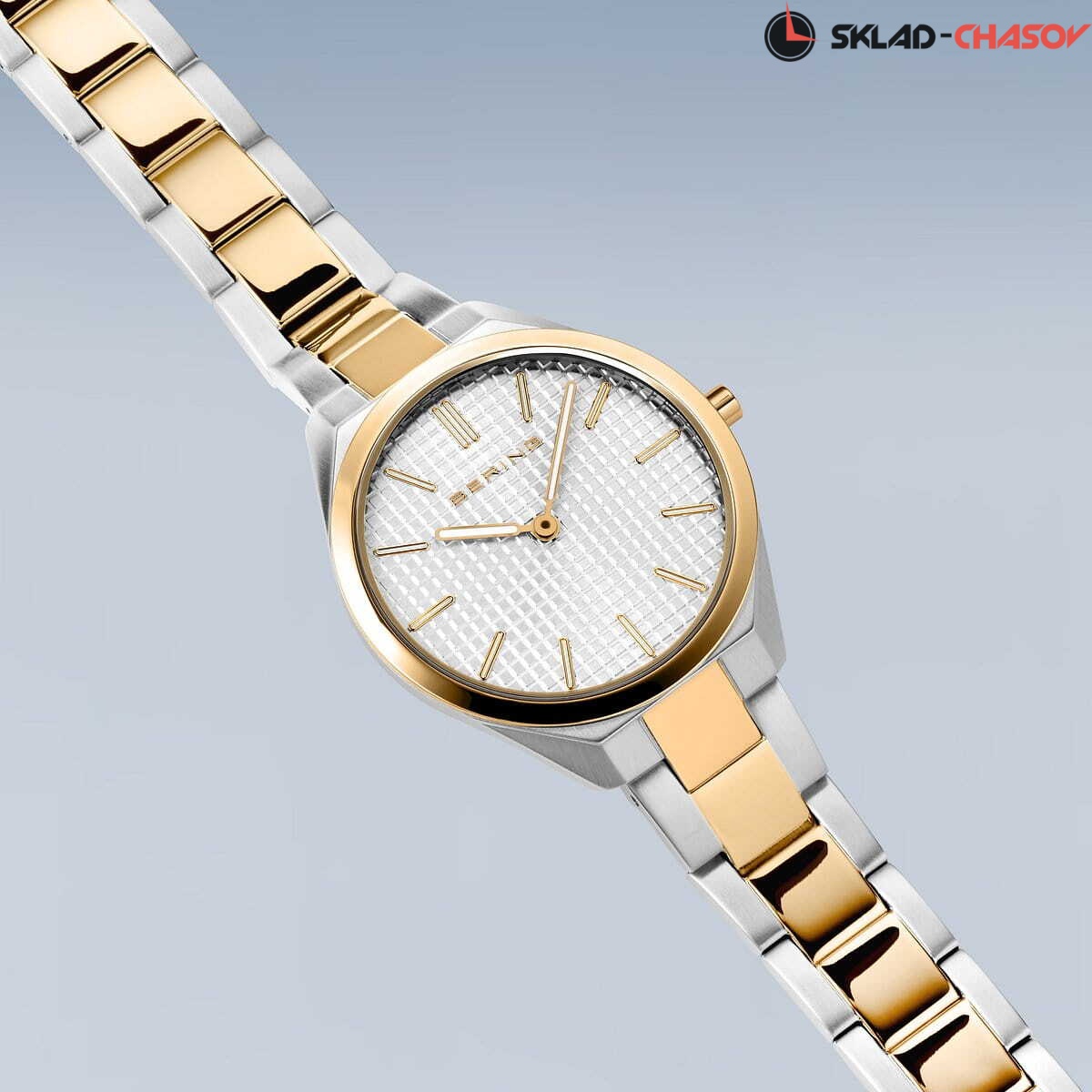 Женские аналоговые кварцевые наручные часы. Ultra Slim .Collection. Механизм Miyota 9T22. Центральные часовая и минутная стрелки. Стрелки с люминесцентным покрытием, которое светится в темноте после непродолжительного воздействия света. Белый циферблат с часовыми метками в виде штрихов. Круглый стальной полированный корпус с покрытием цвета жёлтое золото на безеле. Диаметр корпуса 31 мм, толщина 5 мм. Устойчивое к возникновению мелких царапин плоское сапфировое стекло. Стальной браслет с частичным покрытием цвета жёлтое золота, раскладывающаяся застёжка. Ширина браслета 14 мм. Водозащита WR 30 (брызги).