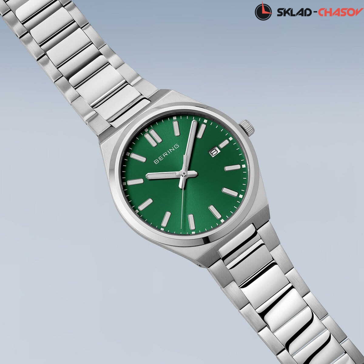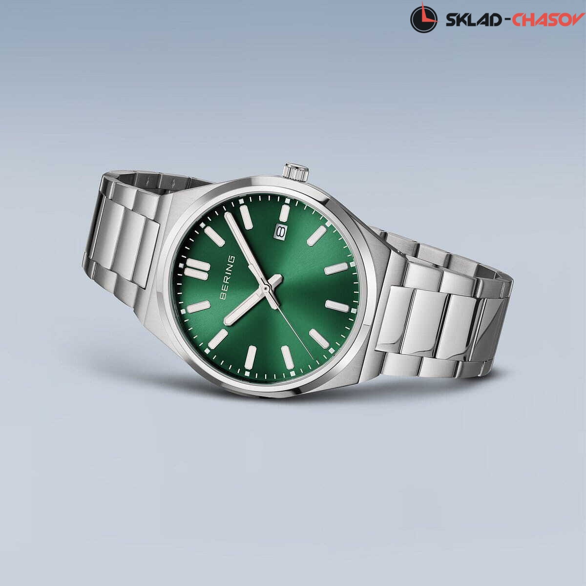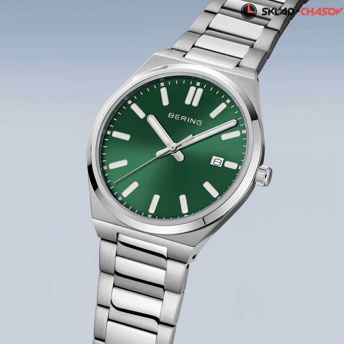 Мужские аналоговые кварцевые наручные часы. Classic Collection. Центральные часовая, минутная и секундная стрелки. Зелёный циферблат с часовыми метками в виде штрихов. Стрелки и метки с люминесцентным покрытием, которое светится в темноте после непродолжительного воздействия света. Окошко даты в положении 3 ч. Круглый стальной полированный корпус. Диаметр корпуса 40 мм, толщина 6 мм. Устойчивое к возникновению мелких царапин плоское сапфировое стекло. Стальной браслет с раскладывающейся застёжкой. Ширина браслета 18 мм. Водозащита WR 50 (мытьё рук, дождь).