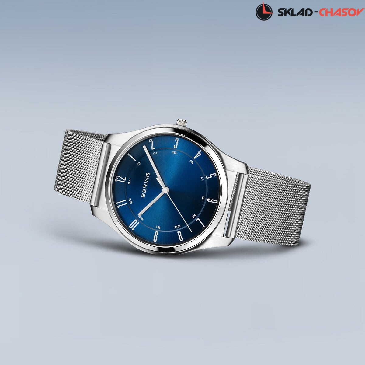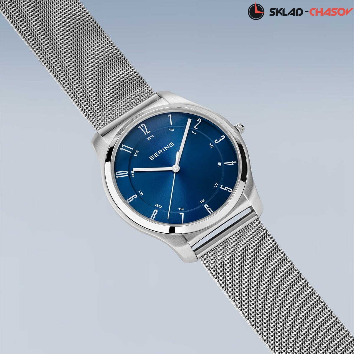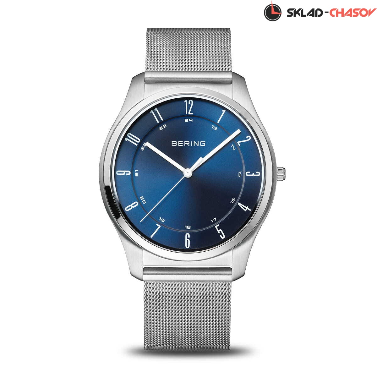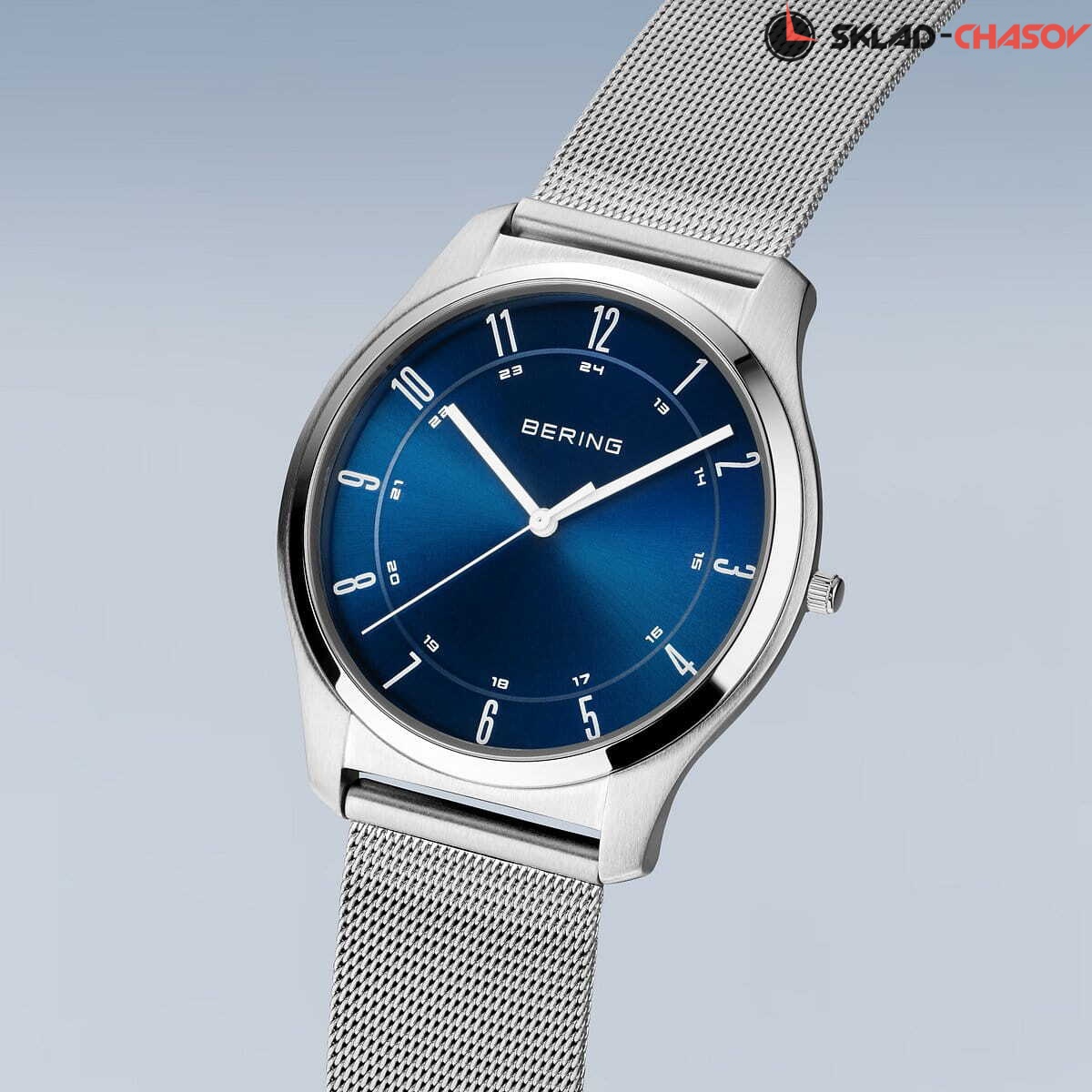 Мужские аналоговые кварцевые наручные часы. Ultra Slim Collection. Центральные часовая, минутная и секундная стрелки белого цвета. Синий циферблат с часовыми метками в виде арабских цифр. Круглый стальной полированный корпус. Диаметр корпуса 40 мм, толщина 6 мм. Устойчивое к возникновению мелких царапин плоское сапфировое стекло. Стальной браслет миланского плетения. Ширина браслета 20 мм. Водозащита WR 30 (брызги).