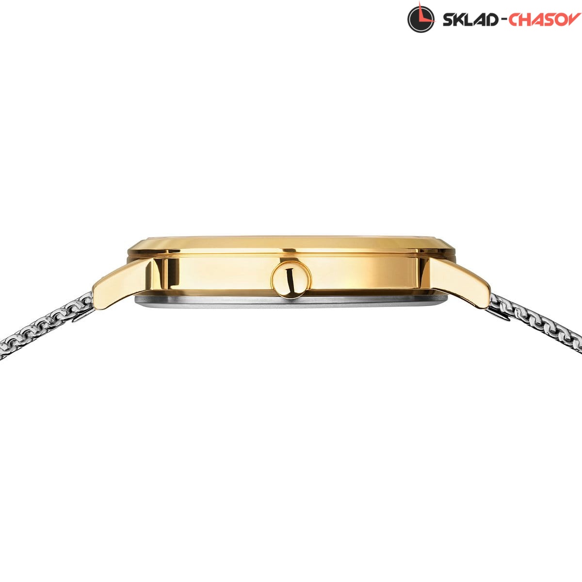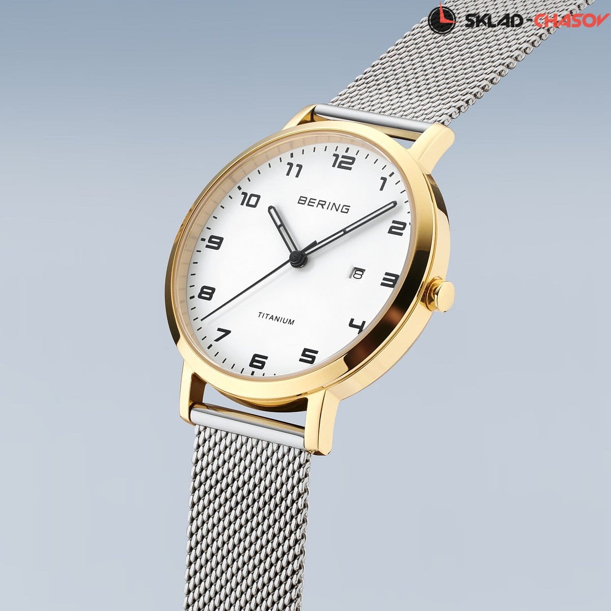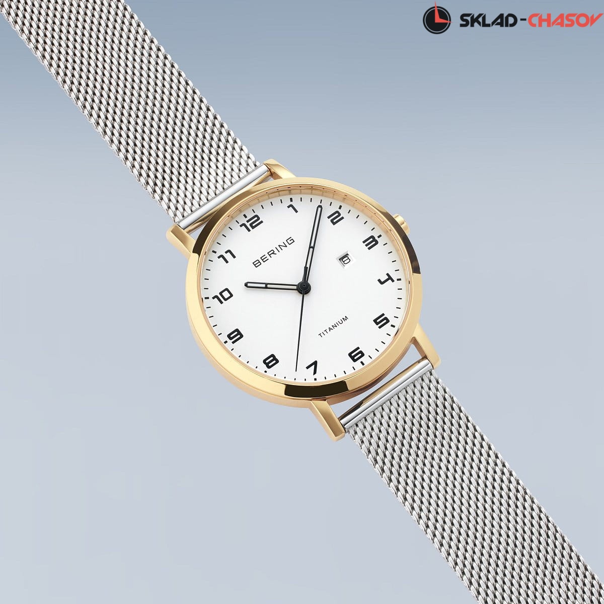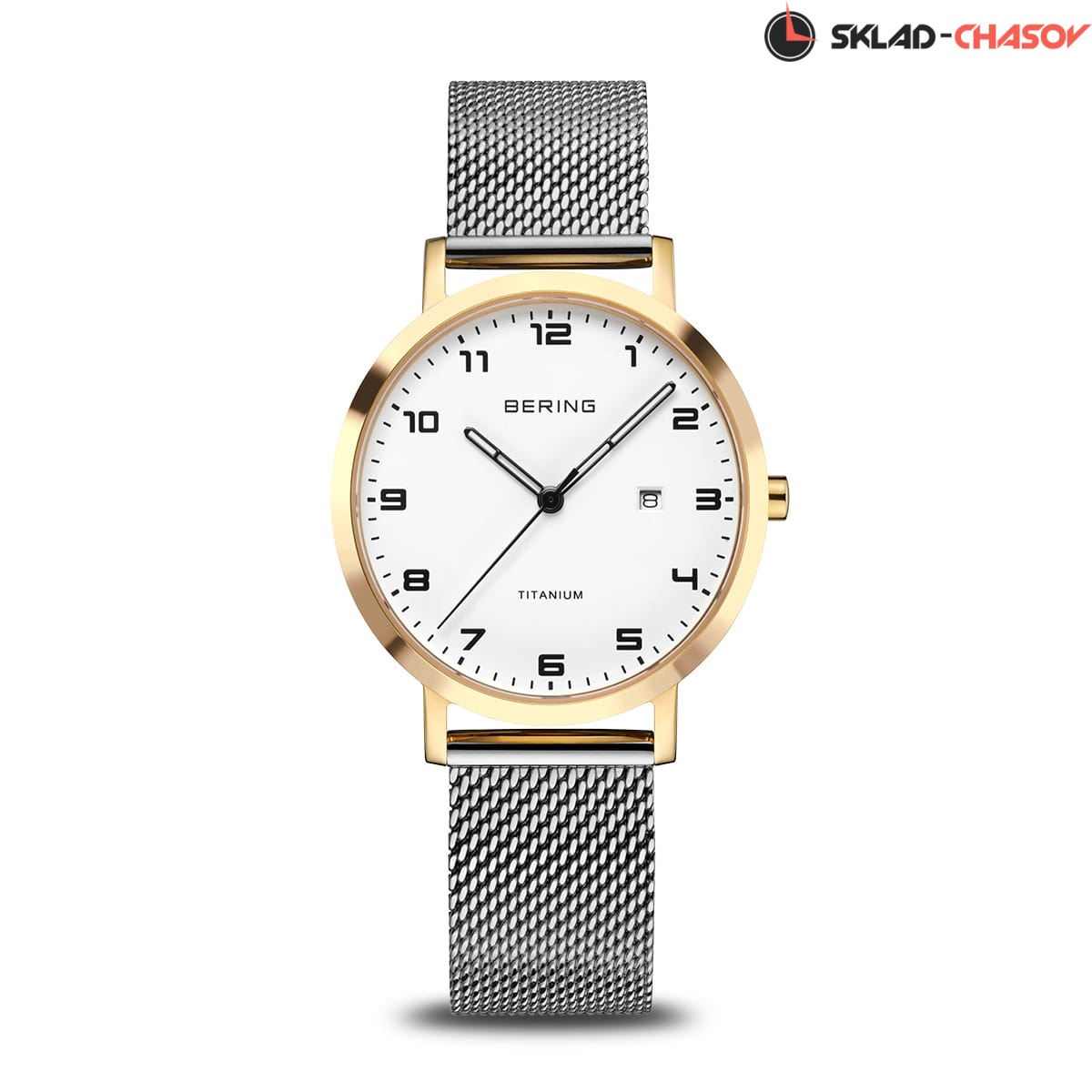 Полированный титановый корпус с золотым IP-покрытием. Диаметр 34мм.