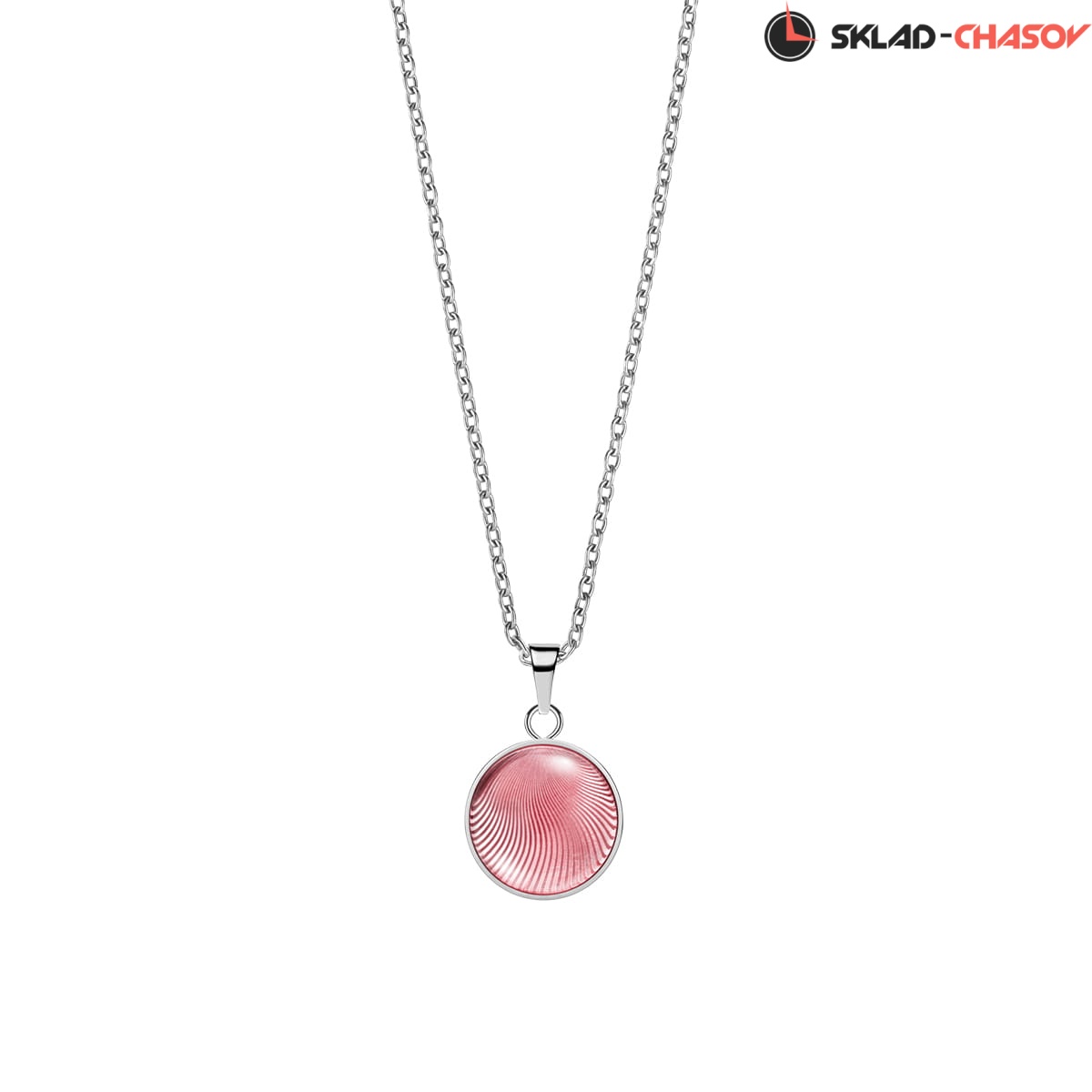 Подвеска в виде ракушки розового цвета со стальной цепочкой.