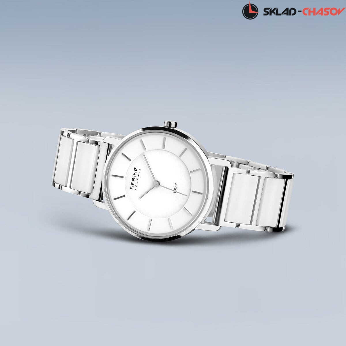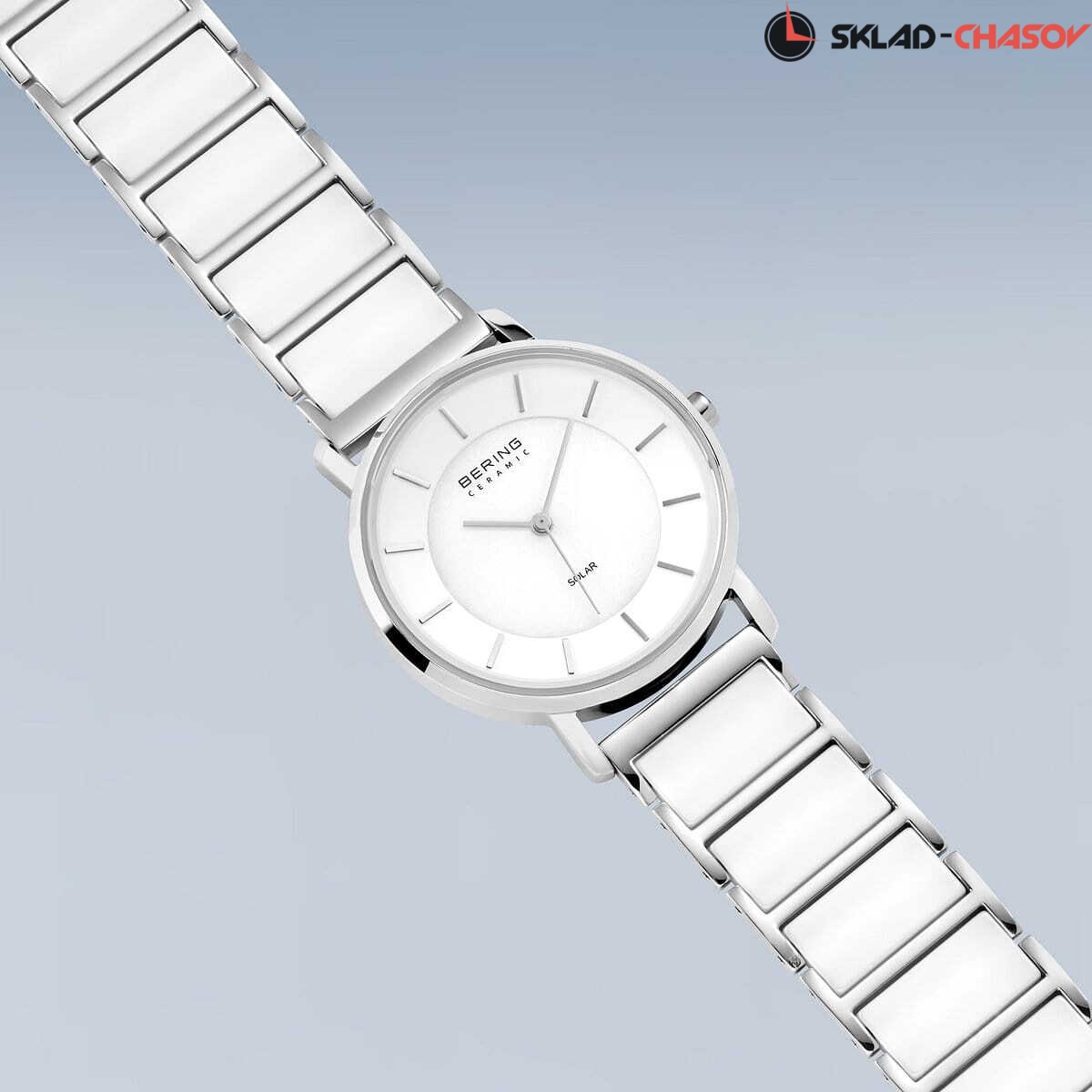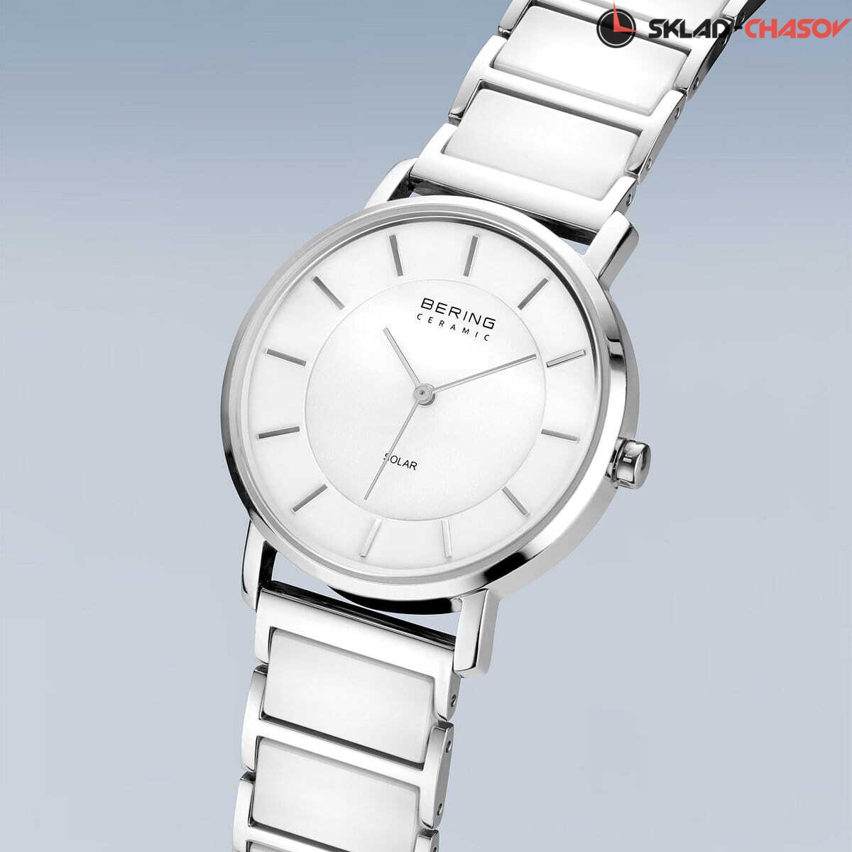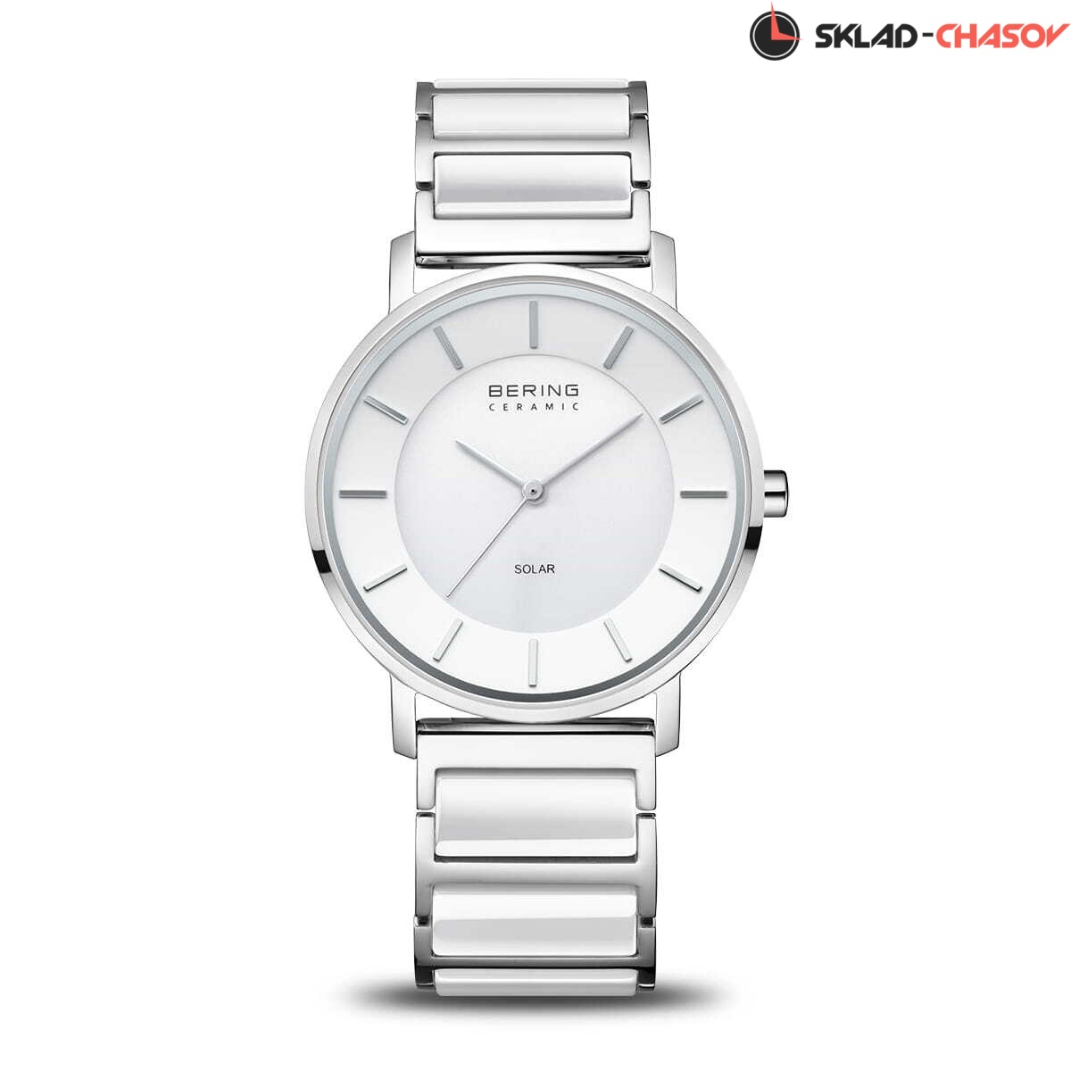 Женские кварцевые аналоговые наручные часы на солнечной батарее. Коллекция Solar Ceramic. Механизм Epson AS01AM. Центральные часовая, минутная и секундная стрелки. Белый керамический циферблат с часовыми метками в виде штрихов. Питание от солнечной энергии - источником питания служит светочувствительная панель и аккумулятор, заряжаемый при попадании солнечного света на циферблат часов. Запас хода после полной зарядки от 6 до 12 месяцев. Круглый стальной полированный корпус. Диаметр корпуса 35 мм, толщина 8 мм. Устойчивое к возникновению мелких царапин плоское сапфировое стекло. Браслет из нержавеющей стали с керамическими звеньями белого цвета. Ширина браслета 18 мм. Керамический материал очень легкий и устойчивый к царапинам, и также обладает «эффектом гладкого прикосновения» - для ощущения особой мягкости при ношении. Водонепроницаемость WR 30 (брызги).