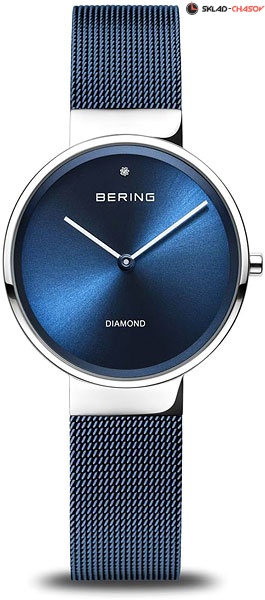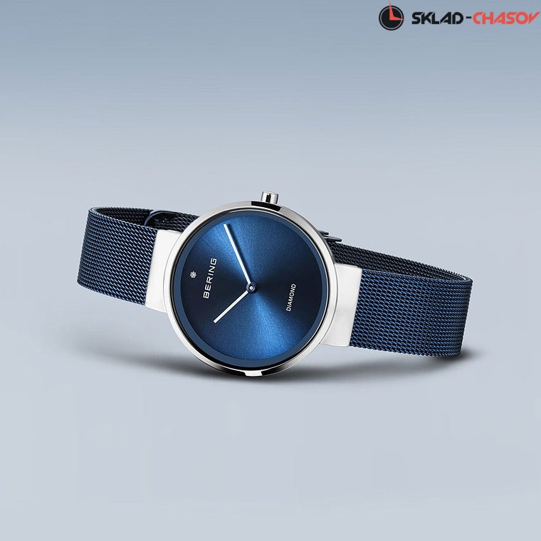 Синий циферблат с гильошированием в виде солнечных лучей и кристаллом.
