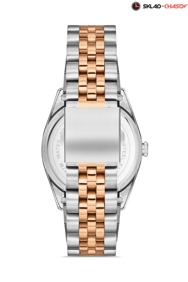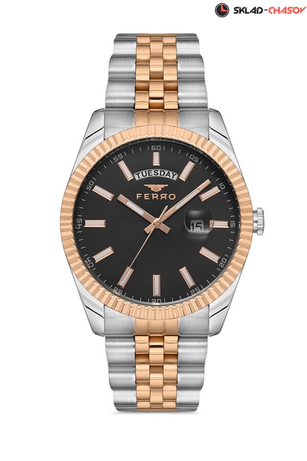 Классические мужские наручные часы с рельефным безелем и браслетом из нержавеющей стали с застежкой-бабочкой. Стрелки и индексы покрыты люминесцентным составом. Дополнительно имеются окошки даты (с увеличительным стеклом) и дня недели. Рельефная заводная головка идеально сочетается с безелем.