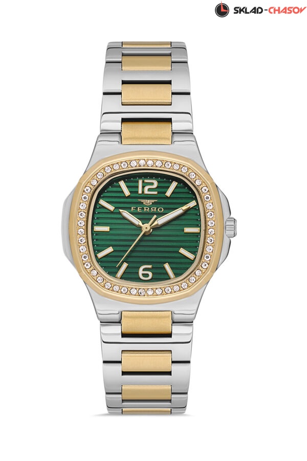 Утонченные женские наручные часы формы мягкий квадрат на браслете из нержавеющей стали с застежкой-бабочкой. Дизайн дополняется циферблатом с линейным паттерном и безелем с кристаллами. Часовая и минутная стрелки, а также индексы покрыты люминесцентным составом.