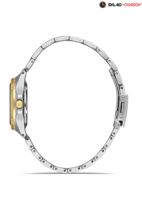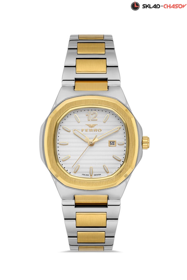 Женские наручные часы с браслетом из нержавеющей стали с застежкой-бабочкой, в котором сатинированные вставки идеально сочетаются с глянцевыми звеньями. Восьмиугольный безель идеально сочетается с линейным паттерном циферблата. Часовая и минутная стрелки, а также индексы покрыты люминесцентным составом. Дополнительно имеется окошко даты. Имеется пара в мужском исполнении (F11514AWT).