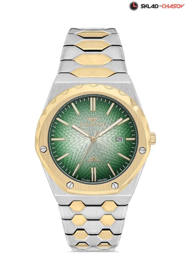 Необычные мужские наручные часы с двойным дизайном. Возможность носить часы в перевернутом виде. Двойной жизайн браслета и безеля. Логотип расположен как у снизу, так и сверху. Градиентный циферблат и ромбовидный паттерн. Стрелки и индексы покрыты люминесцентным составом. Браслет быполнен из нержавеющей стали и застежкой-бабочкой. Дополнительно имеется окошко даты.