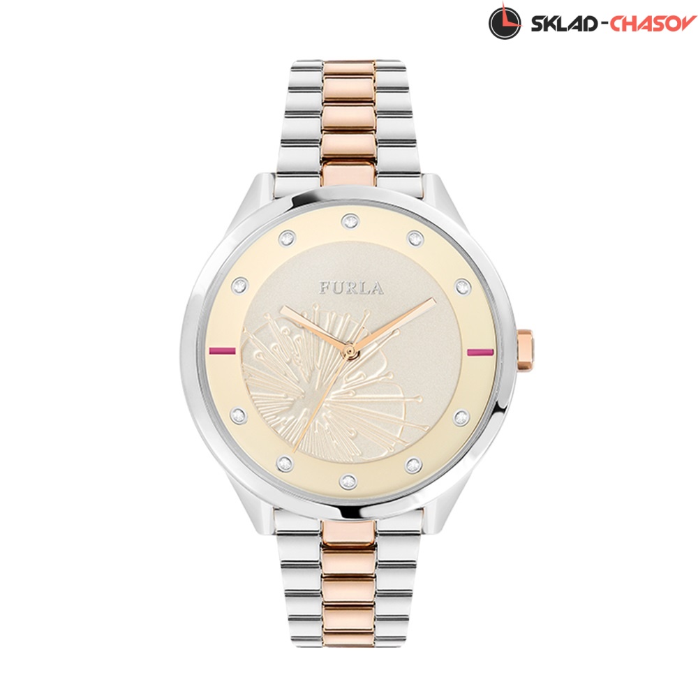 Наручные часы Furla R4253102520 из коллекции Metropolis. Женские. Один из трендов в женских часах – рисунок на циферблате, сдержанный и изысканный. Cоздаст романтическое настроение или подчеркнет женственность их обладательницы. Bicolor корпус и стальной браслет. Цвет циферблата - розовое золото, с метками в виде страз. Диаметр циферблата 38 мм. Механизм: кварцевый. Функции: часы, минуты, секунды. Стекло минеральное, водозащита 3 ATM. Гарантия 2 года.Furla – это яркий и современный итальянский бренд, основанный в 1927 году и представленный более, чем в 100 странах. Воплощение идеального качества, оригинального творческого подхода, эмоций и современного итальянского стиля жизни.