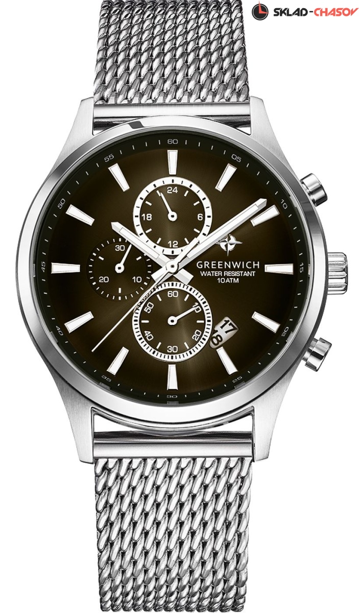 Хронограф с кварцевым механизмом серии Navigator — ваш надежный и функциональный помощник в любом путешествии. Корпус модели диаметром 43 мм сделан из нержавеющей стали. Этот гипоаллергенный материал хорошо подходит для ежедневного контакта с кожей запястья. На полированном циферблате цвета хаки с эффектом градиента размещены счетчики минут и секунд, 24-х часовой индикатор, оригинальное окошко даты. Люминесцентное покрытие центральных стрелок и рисок позволяет легко определить время даже в темноте. Повышенная водостойкость часов равна 10 атмосфер. Часы комплектуются миланским браслетом из нержавеющей стали с удобной застежкой. Она легко передвигается по полотну браслета и позволяет регулировать его длину самостоятельно.