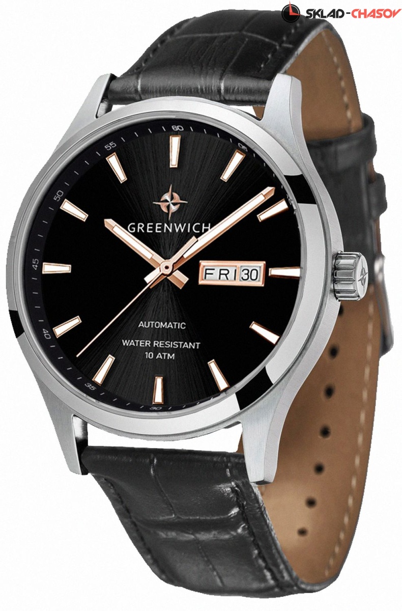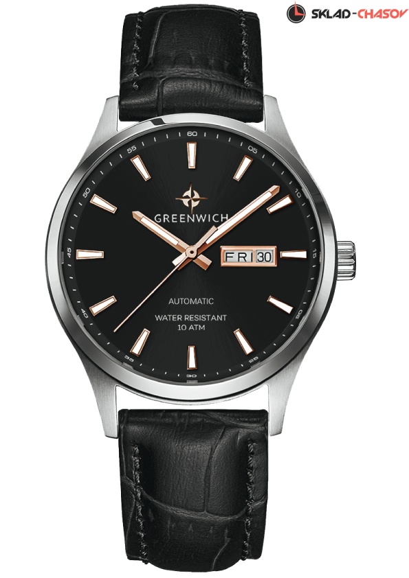 Часы дополняет ремешок из натуральной кожи черного цвета с прошивкой. Автоматические часы Greenwich хорошо подходят для того, чтобы носить их каждый день. Их универсальный дизайн сочетается практически с любыми предметами гардероба, а механизм заводится, находясь на запястье владельца.