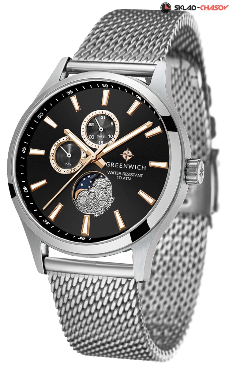 В круглом корпусе из нержавеющей стали заключен кварцевый механизм с полезными функциями даты, дня недели и фаз Луны. Каждый индикатор, расположенный на черном циферблате, выделен накладной рамкой. Индикатор в позиции «6 часов» украшает декоративный элемент с объемным рисунком, который напоминает кратеры на лунной поверхности. Стрелки и риски декорированы люминесцентным составом, который светится в темноте. Повышенная водостойкость часов составляет 10 атмосфер, что позволяет спокойно в них плавать. Часы установлены на миланский браслет из нержавеющей стали с удобной застежкой. Она легко передвигается по полотну браслета и позволяет регулировать его длину самостоятельно. Гарантия: 24 месяца.