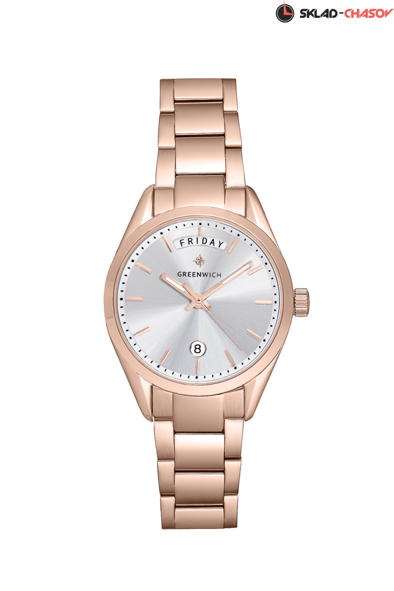 Новая коллекция Astrea от бренда Greenwich была названа в честь Астреи, древнегреческой богини точности. За точность в часах отвечает кварцевый механизм TMI, благодаря которому на белом циферблате отображается время (часы, минуты, секунды), дата и день недели. Обратите внимание на индикатор дня недели: он достаточно широкий, чтобы вместить название дня полностью, что, конечно, улучшает восприятие информации. Круглый корпус диаметром 34 мм сделан из нержавеющей стали с PVD-покрытием из розового золота, как и литой браслет с надежной застежкой-клипсой. Повышенная водостойкость равна 10 атмосфер. Часы Astrea хорошо сочетаются с повседневными образами, а из-за лаконичного размера корпуса модель изящно смотрится на любом запястье.