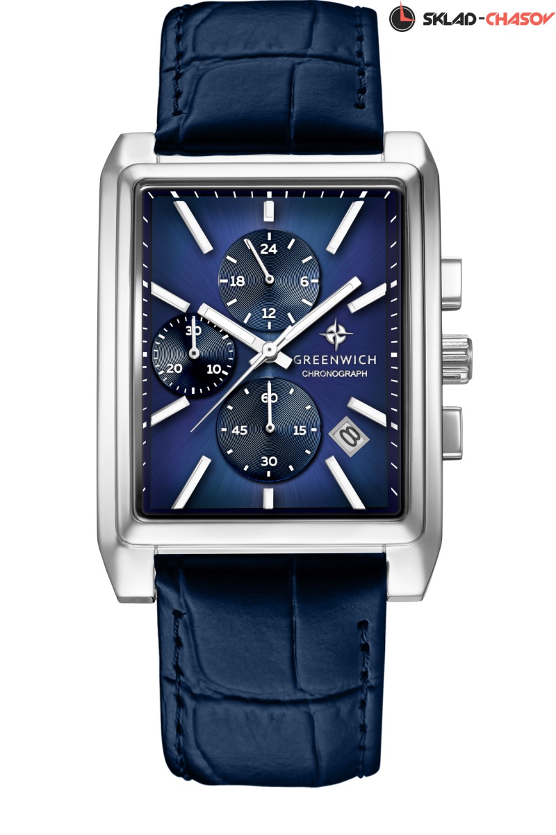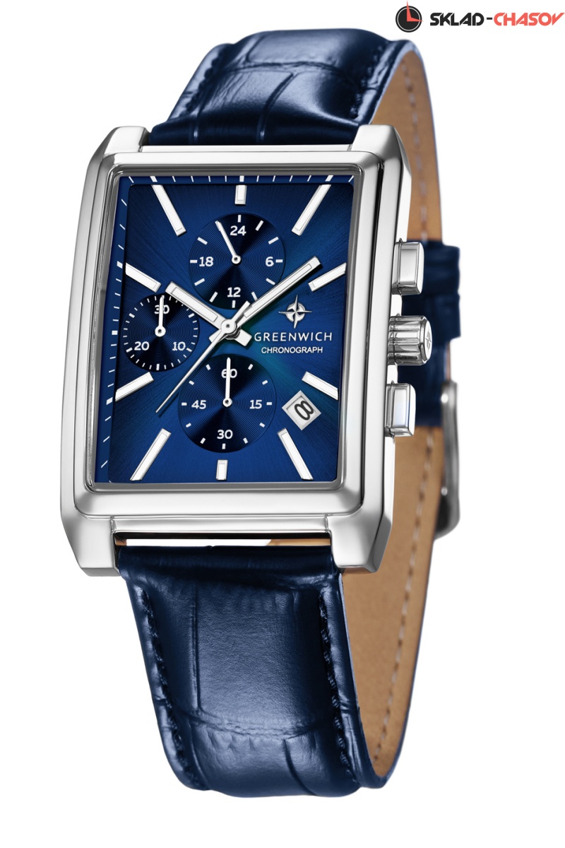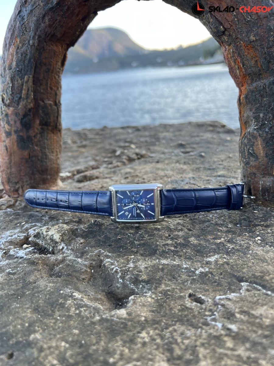 Кварцевый механизм часов серии Galeon Chrono позволяет точно определять время, дату и пользоваться функциями хронографа: засекать время в минутах и секундах. Плюс к этому, на синем циферблате модели есть индикатор 24-х часов (демонстрирует время в формате 24-х часов). Защищает механизм корпус прямоугольной формы из нержавеющей стали. Стрелки и риски светятся в темноте — они покрыты специальным люминесцентным составом. Ремешок часов выполнен из натуральной кожи синего цвета, прошивка продлевает срок его службы. Серия Galeon Chrono - это сочетание спортивного функционала и классической элегантности. Часы хорошо дополнят тот образ, который вы выберете сегодня, от классического костюма до расслабленного casual.
