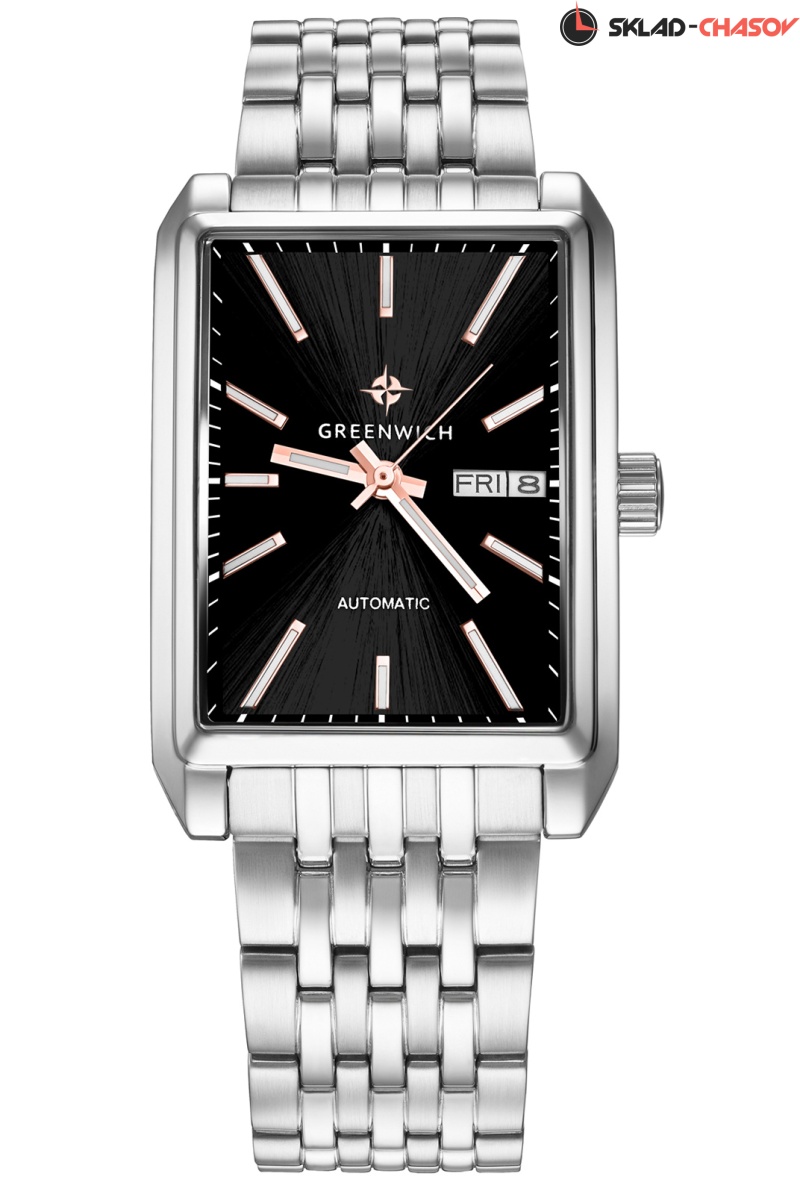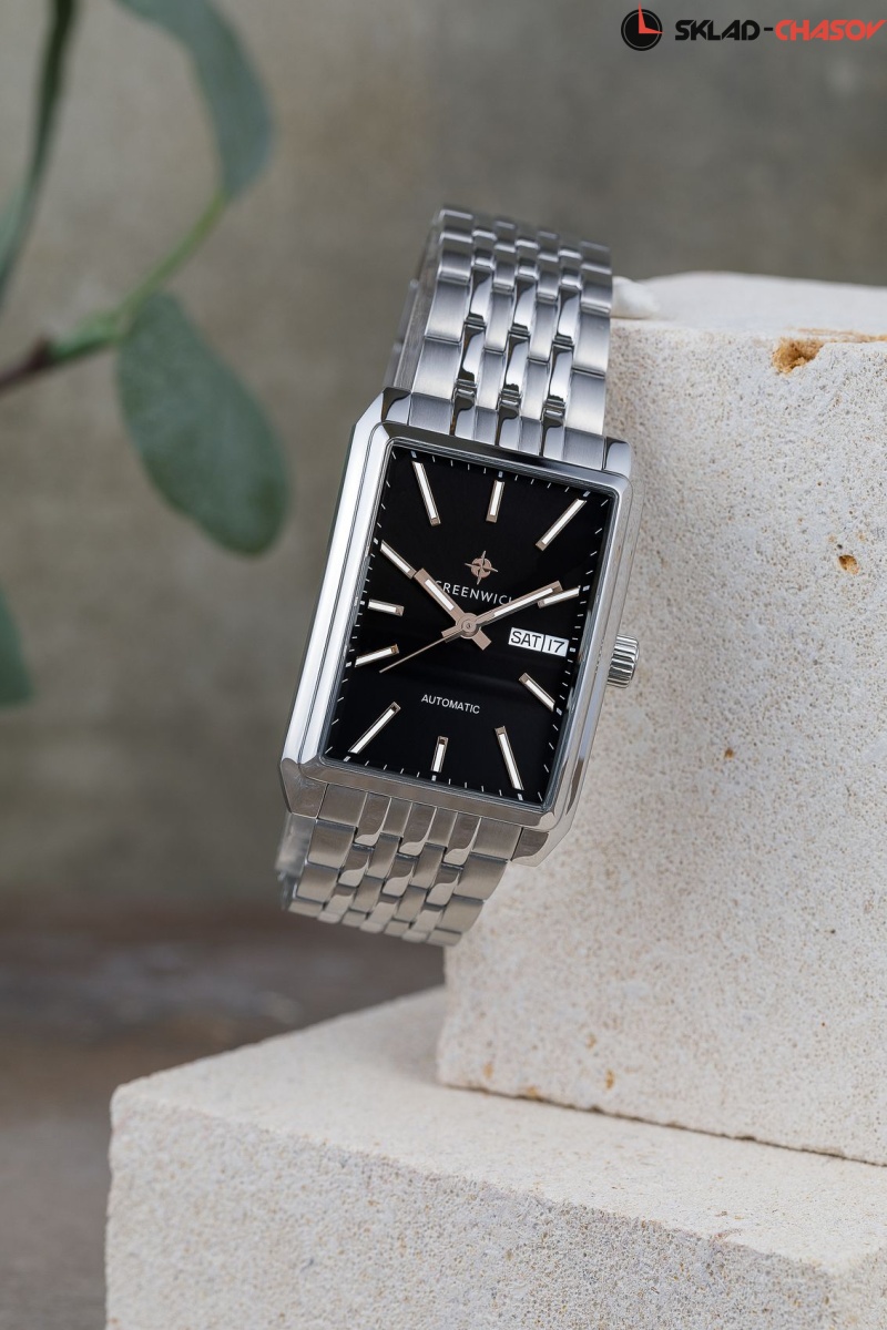 Новое прочтение классических часов от Greenwich: часы в прямоугольном корпусе со скошенными углами серии Caravel В качестве основного материала была выбрана гипоаллергенная нержавеющая сталь, из нее сделаны корпус и браслет модели. За движение стрелок, дисков даты и дня недели на черном циферблате отвечает механизм с функцией автоподзавода. За его работой можно наблюдать через прозрачное окошко на задней крышке часов. Стрелки и риски светятся в темноте — они покрыты люминесцентным составом. На браслете установлена застежка-клипса, надежная и удобная в использовании. Механические часы Caravel подходят для ежедневного использования, тем более, что в таком режиме ротор будет заводить пружину механизма от обычных движений руки, без необходимости завода с помощью заводной головки.