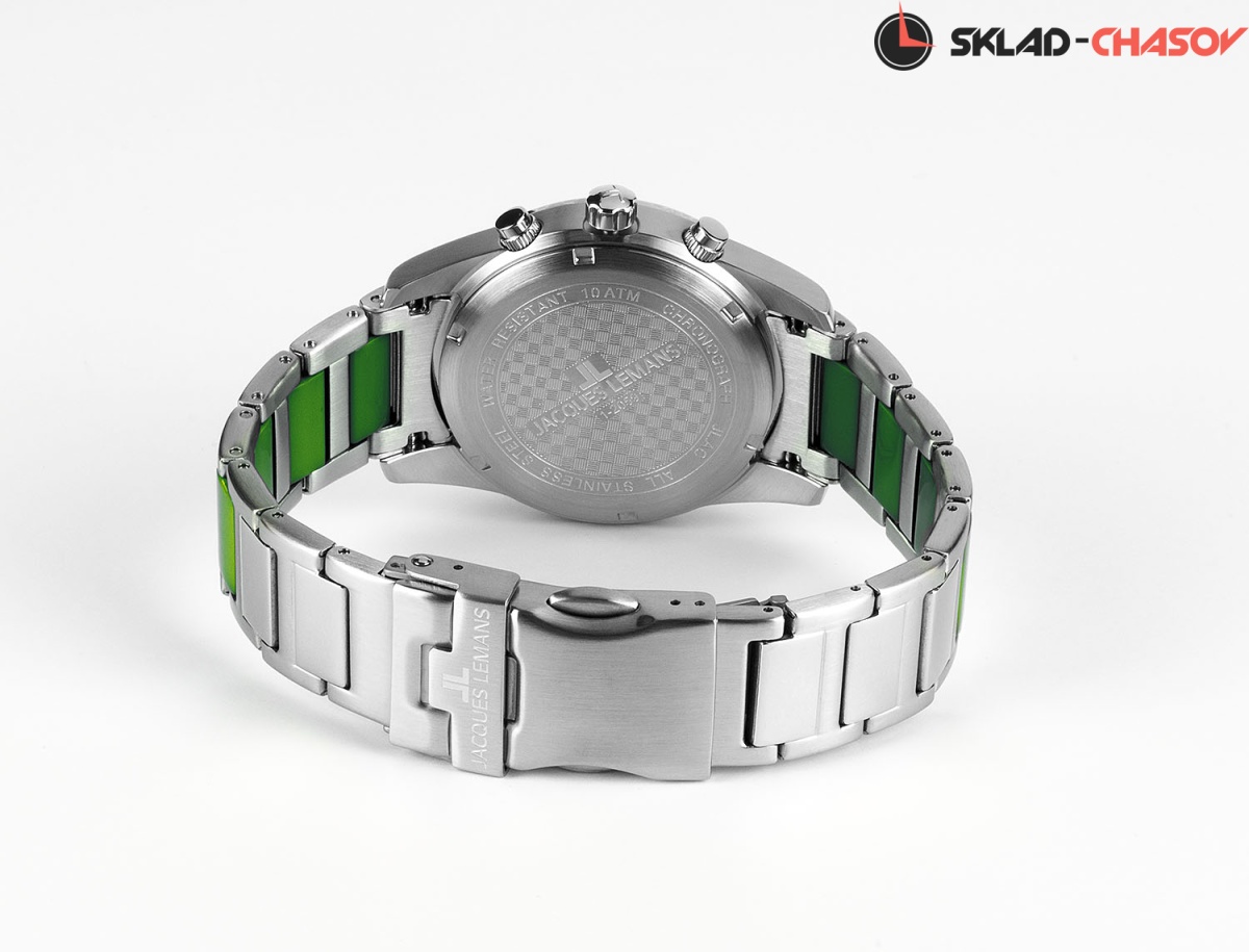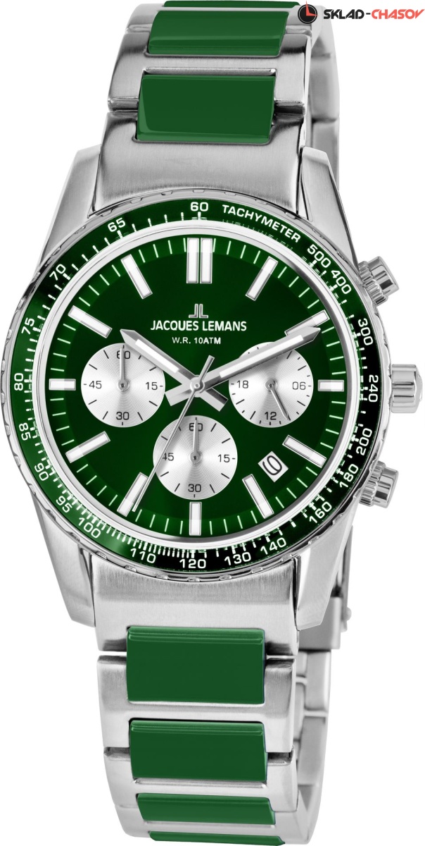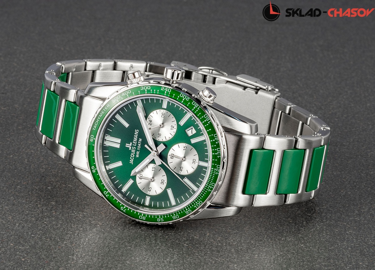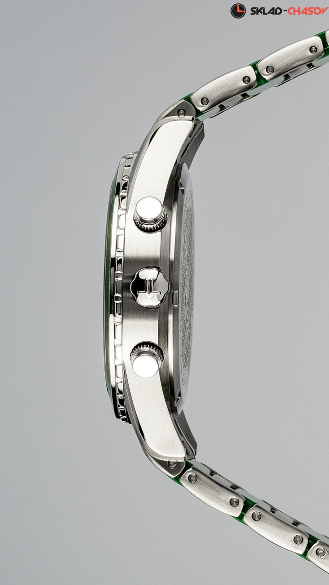 Современный и технически продуманный кварцевый хронограф коллекции Liverpool. Круглый корпус диаметром 39 мм сделан из прочной нержавеющей стали. Ее отличают гипоаллергенные свойства, что очень важно при ежедневном использовании часов. На зеленом циферблате расположены хорошо читаемые стрелки, риски и контрастные дополнительные индикатор 24-х часов, минутный и секундный накопители. Индикатор даты — в позиции «3 часа». Тахиметрическая шкала вынесена на безель. В часах установлено ударопрочное минеральное стекло Crystex. Повышенная водостойкость равна 10 атмосфер. Контрастное чередование стальных и полиуретановых звеньев смотрится стильно и ярко. Так же, это делает браслет более легким. Эти часы хорошо дополнят как спортивный, так и повседневный образ.