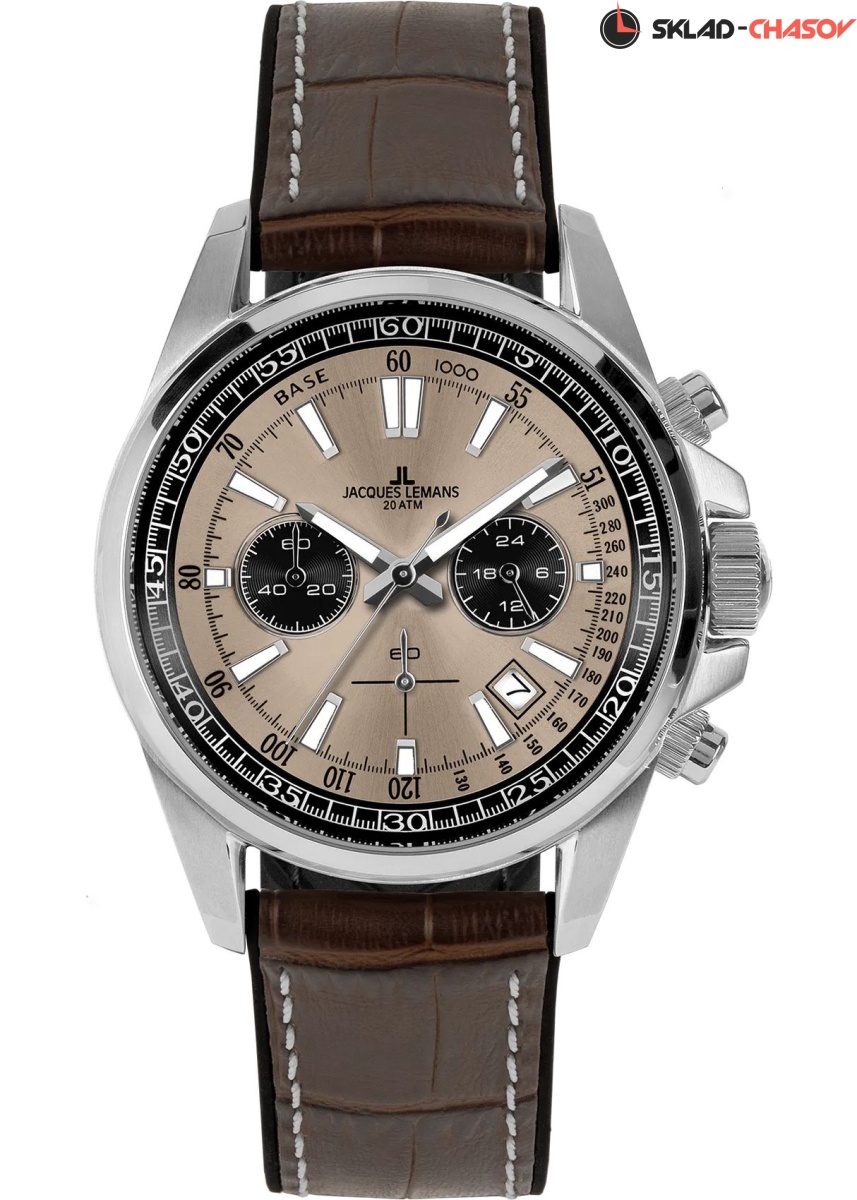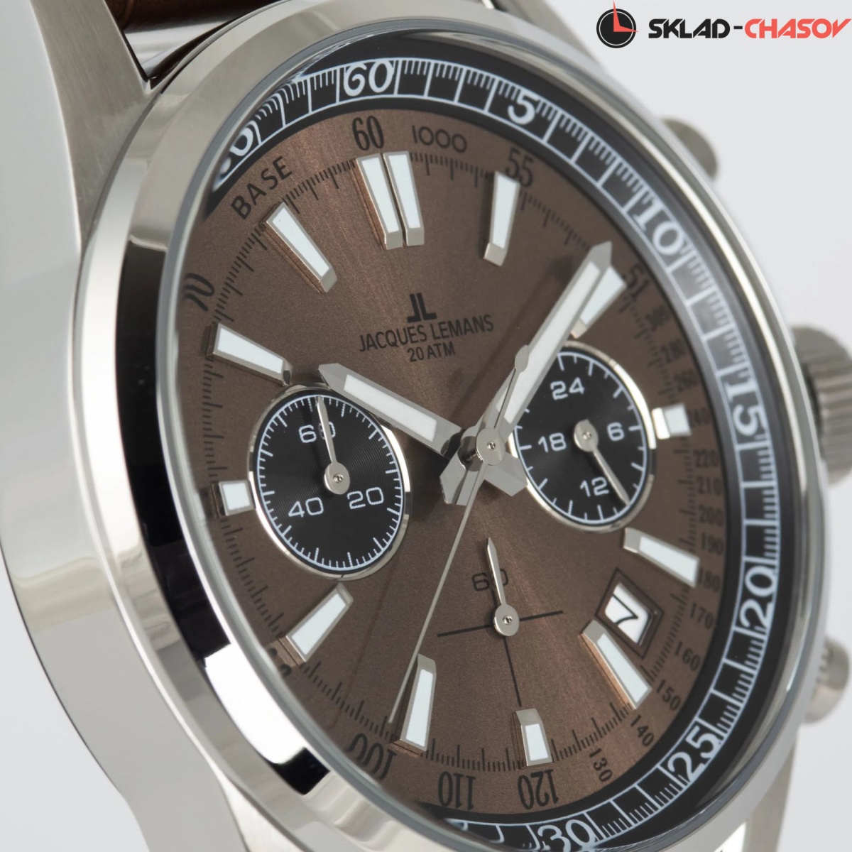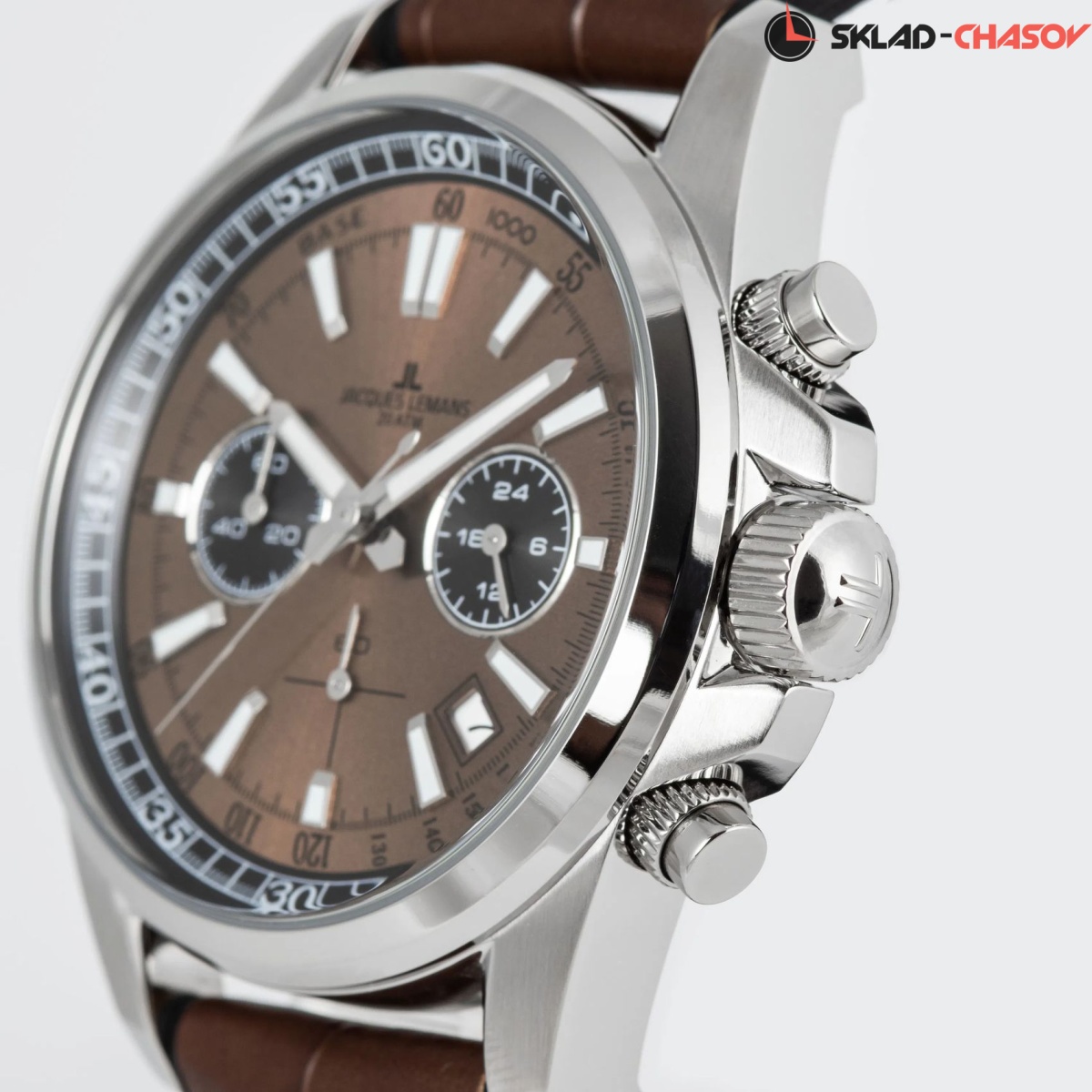 Новинка в знаменитой серии 2117 от Jacques Lemans: стильный кварцевый хронограф с повышенной водостойкостью 20 атмосфер, которую обеспечивают завинчивающаяся заводная головка и задняя крышка. Массивный корпус диаметром 44 мм сделан из нержавеющей стали. Кнопки хронографа продуманного размера удобно использовать, а для рельефной заводной головки предусмотрена дополнительная защита. На бежевом циферблате с полировкой в виде солнечных лучей расположены крупные часовая и минутная стрелки и риски с люминесцентным покрытием, которое помогает определить время даже в темноте. Хорошо читаются дополнительные индикаторы 24-х часов, счетчики минут и секунд, окошко даты. Предусмотрена тахиметрическая шкала: ее используют, например, для определения скорости. В часах установлено ударопрочное минеральное стекло. Ремешок модели состоит из двух слоев: верхний — из натуральной кожи коричневого оттенка, внутренний — из рельефного силикона. Такая конструкция повышает износостойкость ремешка, позволяя не опасаться повышенной влажности. Застежка-пряжка выполнена из стали с гравировкой в виде логотипа бренда. Хронограф 1-2117 — удобный в использовании и надежный аксессуар, который, помимо функциональности, станет отражением чувства стиля своего владельца.