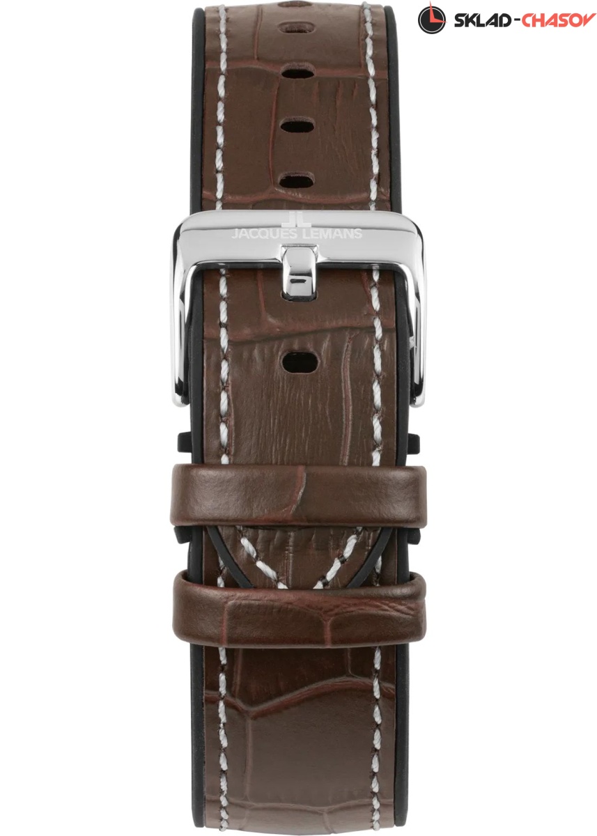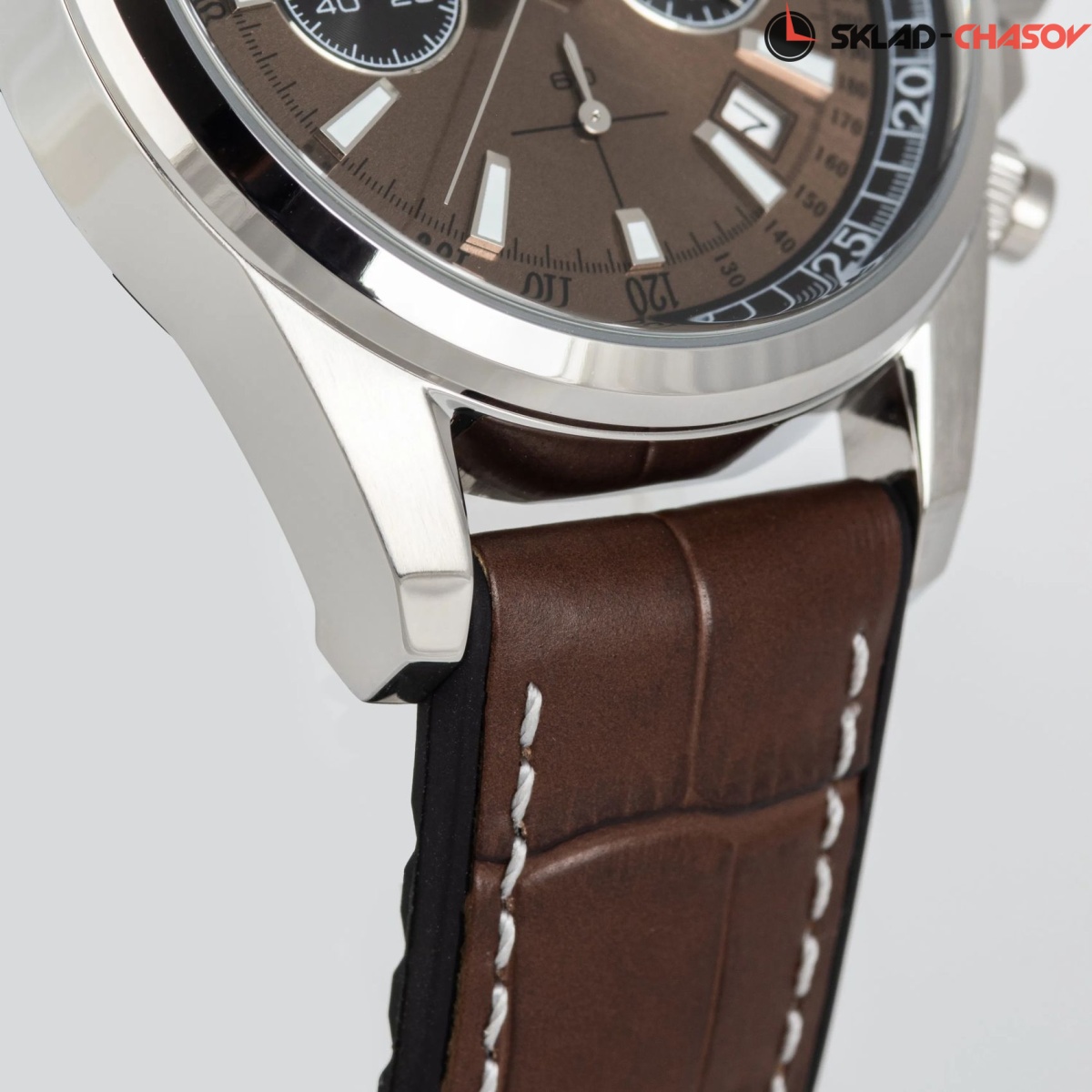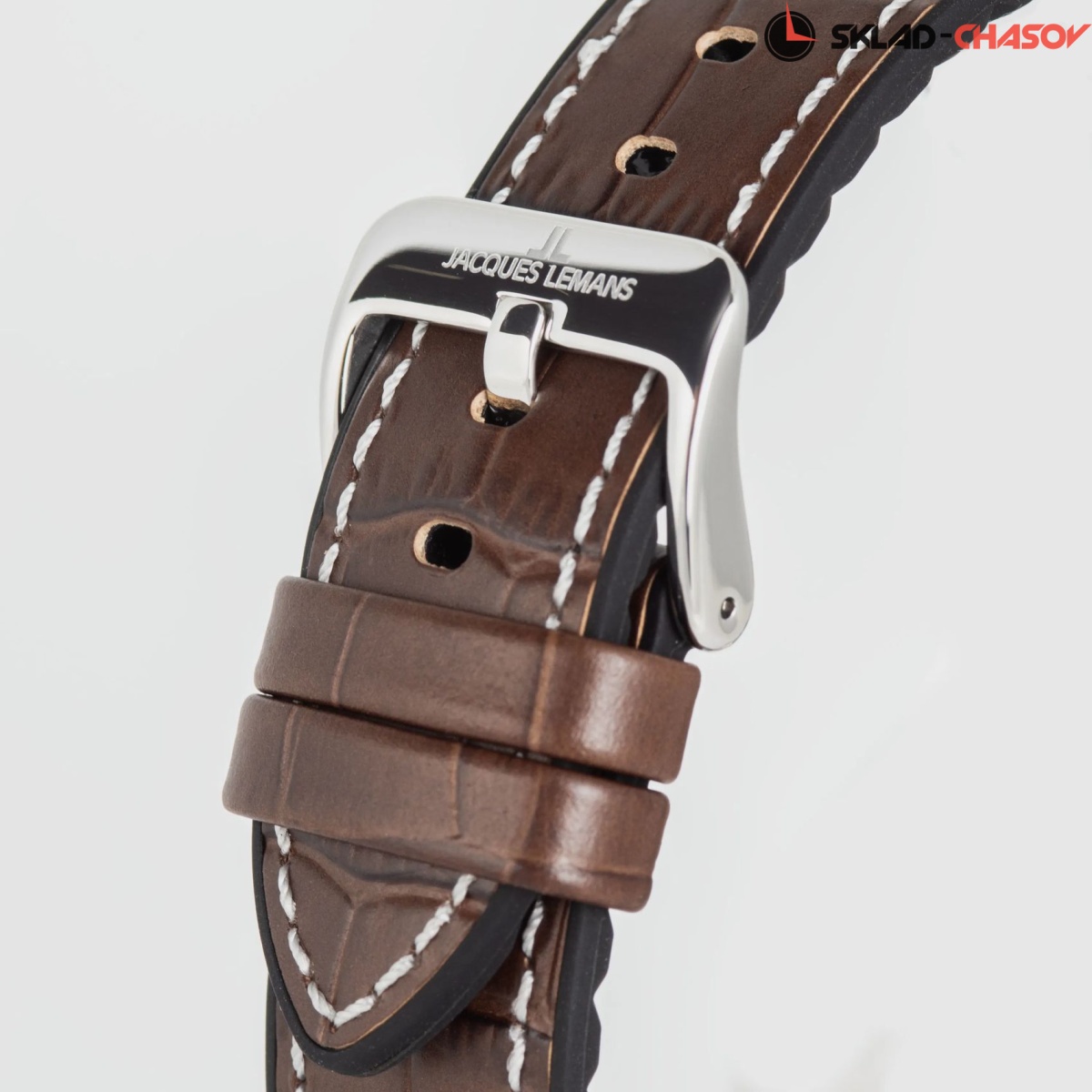 Новинка в знаменитой серии 2117 от Jacques Lemans: стильный кварцевый хронограф с повышенной водостойкостью 20 атмосфер, которую обеспечивают завинчивающаяся заводная головка и задняя крышка. Массивный корпус диаметром 44 мм сделан из нержавеющей стали. Кнопки хронографа продуманного размера удобно использовать, а для рельефной заводной головки предусмотрена дополнительная защита. На бежевом циферблате с полировкой в виде солнечных лучей расположены крупные часовая и минутная стрелки и риски с люминесцентным покрытием, которое помогает определить время даже в темноте. Хорошо читаются дополнительные индикаторы 24-х часов, счетчики минут и секунд, окошко даты. Предусмотрена тахиметрическая шкала: ее используют, например, для определения скорости. В часах установлено ударопрочное минеральное стекло. Ремешок модели состоит из двух слоев: верхний — из натуральной кожи коричневого оттенка, внутренний — из рельефного силикона. Такая конструкция повышает износостойкость ремешка, позволяя не опасаться повышенной влажности. Застежка-пряжка выполнена из стали с гравировкой в виде логотипа бренда. Хронограф 1-2117 — удобный в использовании и надежный аксессуар, который, помимо функциональности, станет отражением чувства стиля своего владельца.
