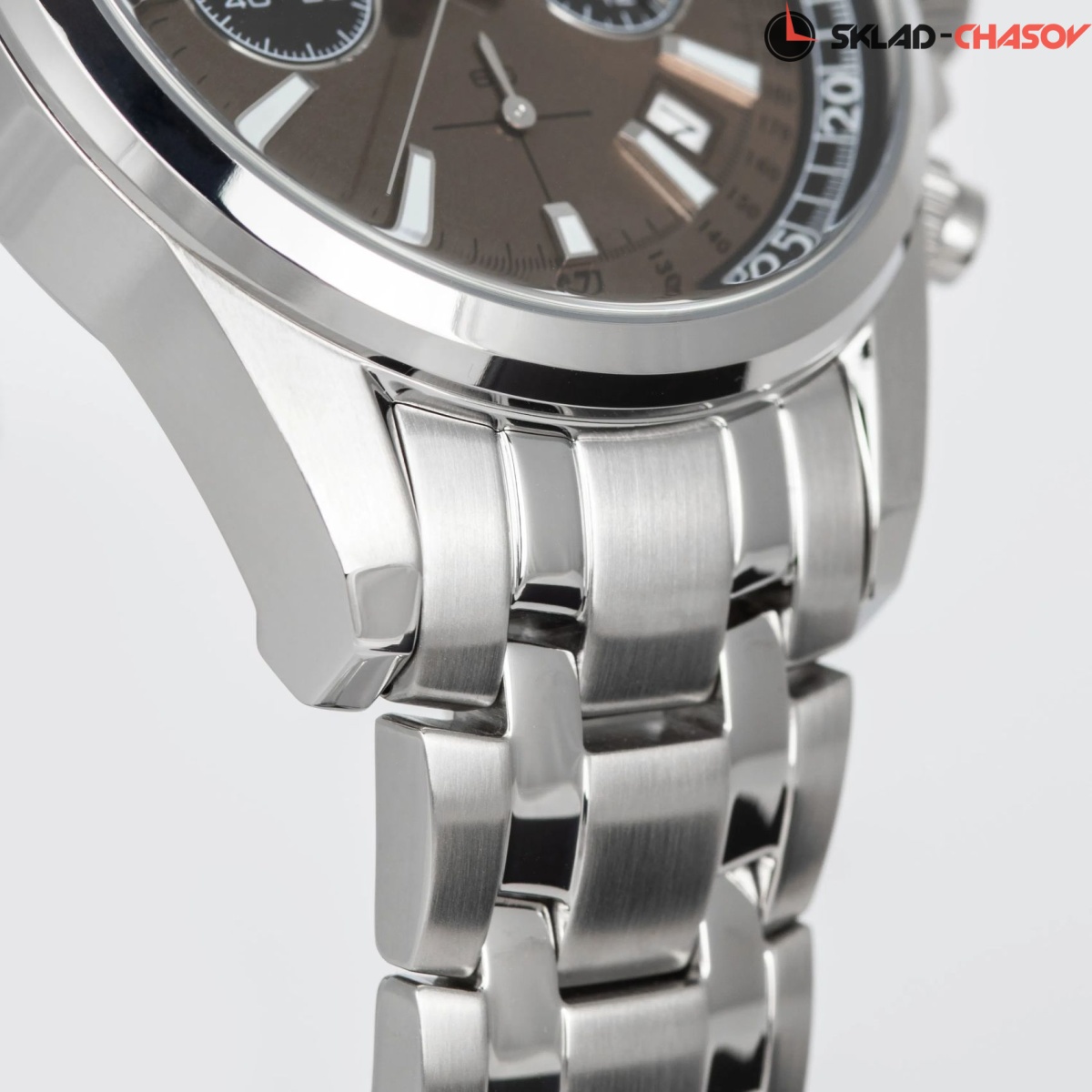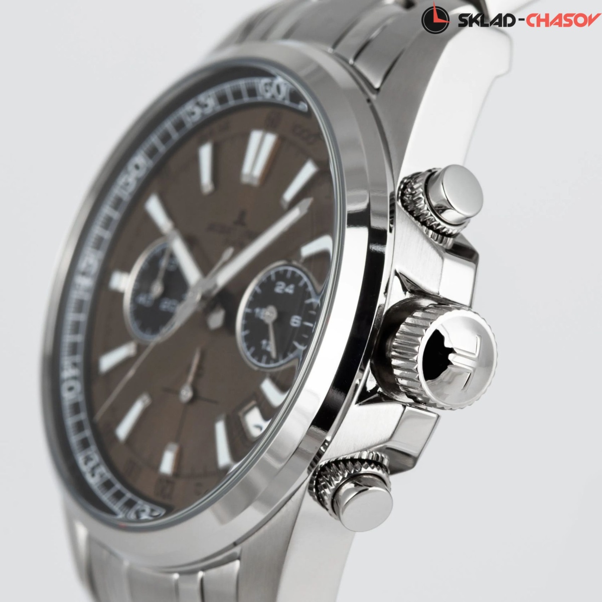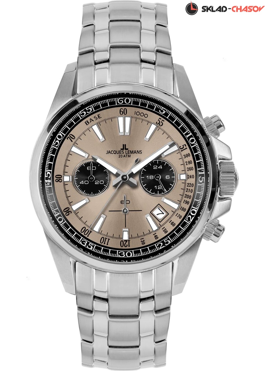 Новинка в знаменитой серии 2117 от Jacques Lemans: стильный кварцевый хронограф с повышенной водостойкостью 20 атмосфер, которую обеспечивают завинчивающаяся заводная головка и задняя крышка. Массивный корпус диаметром 44 мм сделан из нержавеющей стали. Кнопки хронографа продуманного размера удобно использовать, а для рельефной заводной головки предусмотрена дополнительная защита. На бежевом циферблате с полировкой в виде солнечных лучей расположены крупные часовая и минутная стрелки и риски с люминесцентным покрытием, которое помогает определить время даже в темноте. Хорошо читаются дополнительные индикаторы 24-х часов, счетчики минут и секунд, окошко даты. Предусмотрена тахиметрическая шкала: ее используют, например, для определения скорости. В часах установлено ударопрочное минеральное стекло. Браслет модели собран из стальных звеньев с чередованием зеркальной полировки и матирования, что выигрышно подчеркивает его структуру. Стальная застежка-клипса с двумя боковыми кнопками имеет дополнительную защиту от расстегивания. Хронограф 1-2117 — удобный в использовании и надежный аксессуар, который, помимо функциональности, станет отражением чувства стиля своего владельца.