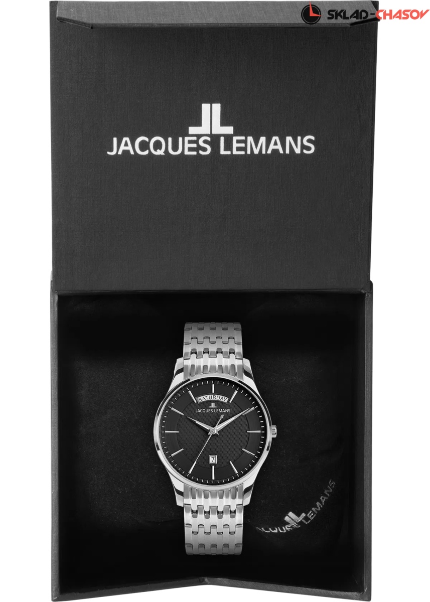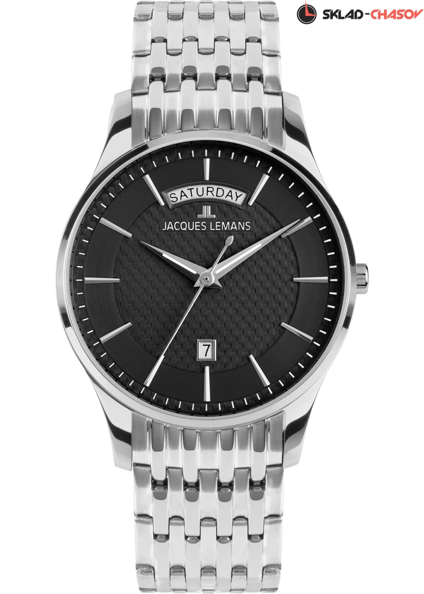 Классический дизайн и надежные материалы: серия 1-2193 включает часы в корпусе из нержавеющей стали с универсальным диаметром 40 мм, внутри которого работает точный кварцевый механизм. Многоуровневый циферблат черного цвета украшен объемным рисунком в центральной зоне. Крупные накладные риски хорошо читаются, стрелки часов и минут покрыты люминесцентным составом, который светится в темноте. Широкое окошко на 12 часах позволяет показывать название дня недели полностью, без сокращений. На 6 часах расположена апертура даты, выделенная рамкой. В модели установлено ударопрочное минеральное стекло. Браслет собран из стальных звеньев, надежная застежка-клипса тоже сделана из нержавеющей стали.