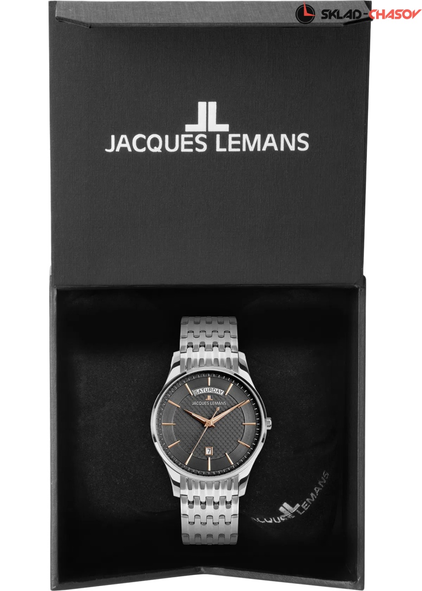 Классический дизайн и надежные материалы: серия 1-2193 включает часы в корпусе из нержавеющей стали с универсальным диаметром 40 мм, внутри которого работает точный кварцевый механизм. Многоуровневый циферблат серого цвета украшен объемным рисунком в центральной зоне. Крупные накладные риски хорошо читаются благодаря PVD-покрытию из розового золота, стрелки часов и минут покрыты люминесцентным составом, который светится в темноте. Широкое окошко на 12 часах позволяет показывать название дня недели полностью, без сокращений. На 6 часах расположена апертура даты, выделенная рамкой. В модели установлено ударопрочное минеральное стекло. Браслет собран из стальных звеньев, надежная застежка-клипса тоже сделана из нержавеющей стали.