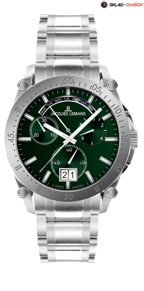 Серия 1-2198 обладает маркировкой Swiss made (в пер. с англ. «сделано в Швейцарии»), два эти слова можно увидеть на зеленом циферблате модели. Внутри массивного 44-миллиметрового корпуса из нержавеющей стали работает швейцарский механизм Ronda. Для декора корпуса используют зеркальную полировку и декоративные винты, закрепленные на ушках. Циферблат находится под защитой минерального стекла с сапфировым напылением. Крупные центральные стрелки часов и минут сразу привлекают внимание, они покрыты люминесцентным составом, который светится в темноте. Дополнительные индикаторы хронографа позволяют засекать время в минутах, секундах и в 1/10 секунд. Интересно оформлена индикация дня недели: шкала в виде полукруга предусматривает ретроградное движение стрелки, когда, по достижении конца шкалы, стрелка молниеносным скачком возвращается в ее начало. Индикаторы визуально выделяет полировка в виде солнечных лучей. На 6 часах расположено сдвоенное окошко большой даты. Такая конструкция дает возможность использовать арабские цифры более крупного шрифта для повышения читаемости. На безеле выгравирована дополнительная шкала секунд. Повышенная водостойкость модели 10 атмосфер. Браслет состоит из стальных звеньев с эффектной комбинацией зеркальной полировки и матирования. Часы 1-2198 - это продуманное сочетание швейцарского качества и интересных дизайнерских находок. Многофункциональный и надежный аксессуар сделает любой образ завершенным и подчеркнет индивидуальность вашего стиля.