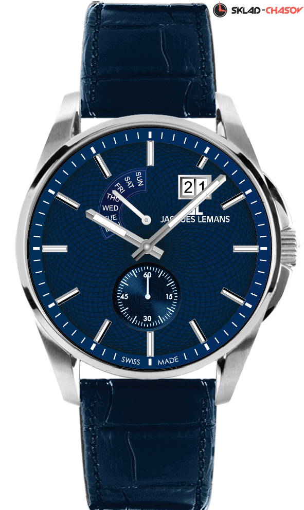 Серия 1-2199 обладает маркировкой Swiss made (в пер. с англ. «сделано в Швейцарии»), два эти слова можно увидеть на синем циферблате модели. Внутри 44-миллиметрового корпуса из нержавеющей стали работает швейцарский механизм Ronda. Циферблат черного цвета декорирован затейливым узором гильоше, который придает ему дополнительный объем. На этом фоне движутся крупные стрелки часов и минут. Как и на накладных рисках, на стрелки нанесен слой люминесцентного покрытия, помогающего определить время даже в темноте. На 6 часов вынесена индикация секунд. Кварцевый механизм предусматривает дополнительные функции: индикатор большой даты и ретроградный индикатор дня недели. В индикаторе большой даты два окошка, что позволяет использовать более крупный, хорошо читаемый шрифт. Стрелка в ретроградном индикаторе дня недели движется по полукругу, скачком возвращаясь в начальное положение. Циферблат защищен минеральным стеклом с сапфировым напылением. Водостойкость 10 атмосфер защищает часы от проникновения влаги даже во время плавания. Плотный ремешок выполнен из натуральной кожи синего цвета, застежка с логотипом бренда сделана из нержавеющей стали. Часы 1-2199 - это продуманное сочетание швейцарского качества и интересных дизайнерских находок. Многофункциональный и надежный аксессуар сделает любой образ завершенным и подчеркнет индивидуальность вашего стиля.