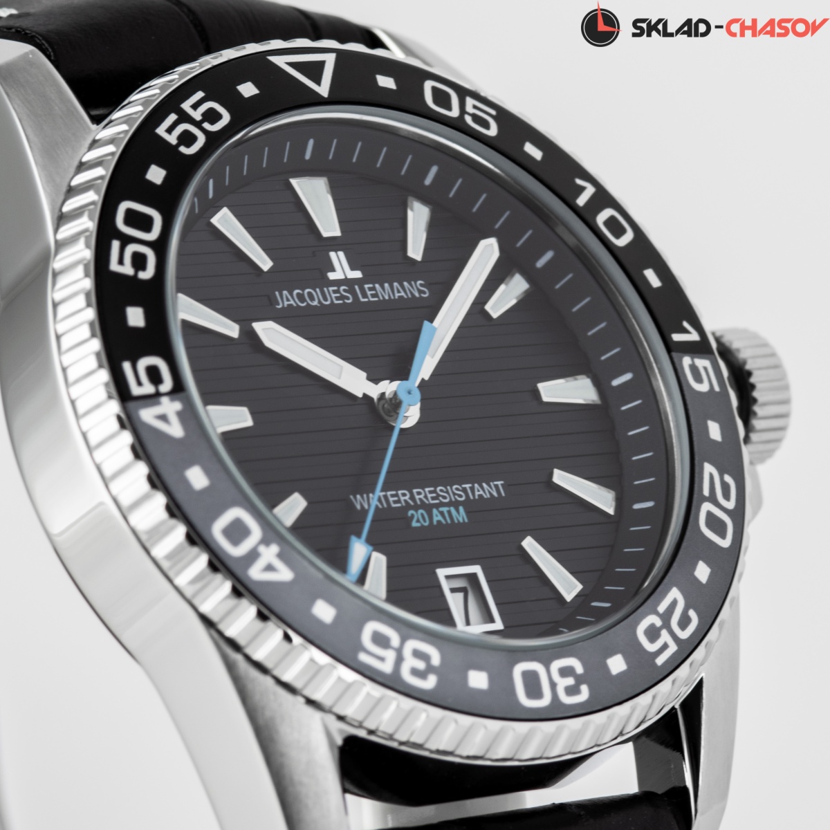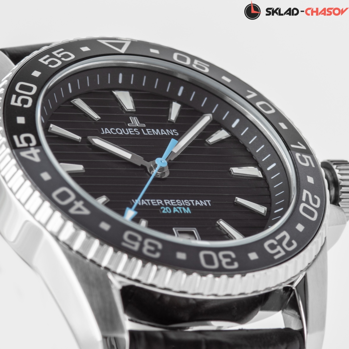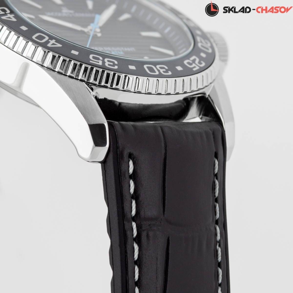 Спортивные часы с повышенной водостойкостью 20 атмосфер оснащены 41-миллиметровым корпусом из нержавеющей стали с широким безелем, на который вынесена дополнительная индикация секунд. Горизонтальные полосы черного циферблата делают его визуально более широким: здесь разместили крупные стрелки и накладные риски с люминесцентном покрытием. На 6 часах расположено окошко даты, выделенное полированной рамкой. Завинчивающаяся заводная головка окружена дополнительной защитой, которая предусмотрена в конструкции корпуса. В модели установлено ударопрочное минеральное стекло. Ремешок черного цвета состоит из двух частей: внутренняя сделана из силикона, материала, который не боится повышенной влажности, внешняя — из натуральной кожи. Такая комбинация имеет несколько преимуществ: ремешок соответствует спортивному характеру часов но, вместе с тем, подчеркивает их универсальность, позволяя сочетать аксессуар и с повседневной одеждой.