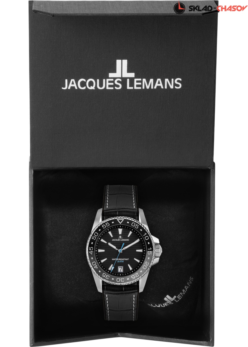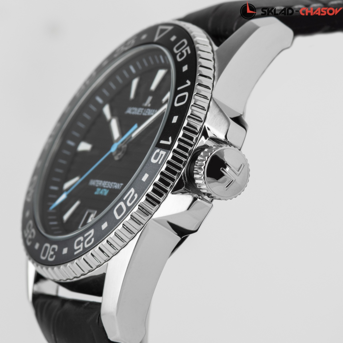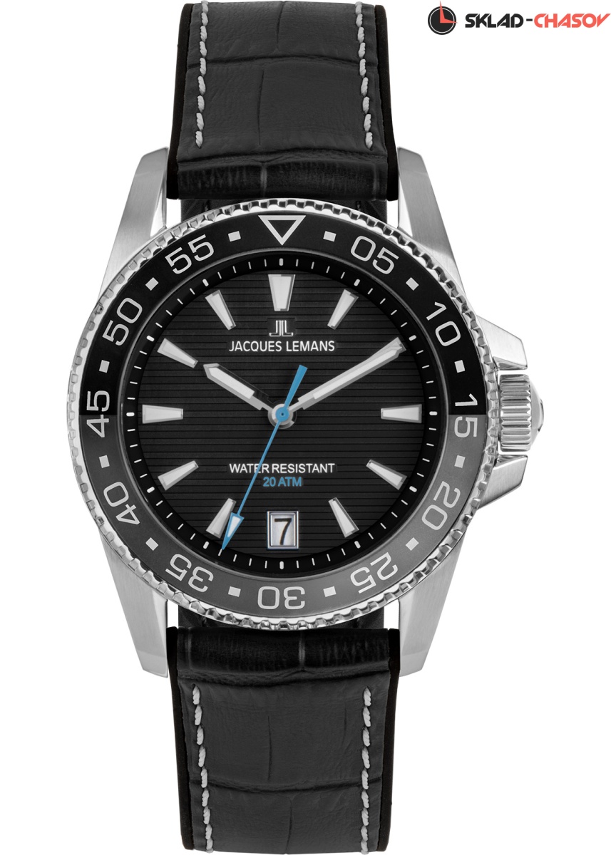 Спортивные часы с повышенной водостойкостью 20 атмосфер оснащены 41-миллиметровым корпусом из нержавеющей стали с широким безелем, на который вынесена дополнительная индикация секунд. Горизонтальные полосы черного циферблата делают его визуально более широким: здесь разместили крупные стрелки и накладные риски с люминесцентном покрытием. На 6 часах расположено окошко даты, выделенное полированной рамкой. Завинчивающаяся заводная головка окружена дополнительной защитой, которая предусмотрена в конструкции корпуса. В модели установлено ударопрочное минеральное стекло. Ремешок черного цвета состоит из двух частей: внутренняя сделана из силикона, материала, который не боится повышенной влажности, внешняя — из натуральной кожи. Такая комбинация имеет несколько преимуществ: ремешок соответствует спортивному характеру часов но, вместе с тем, подчеркивает их универсальность, позволяя сочетать аксессуар и с повседневной одеждой.