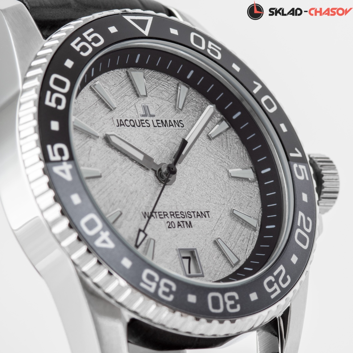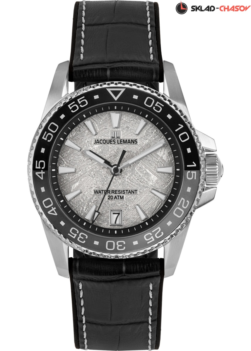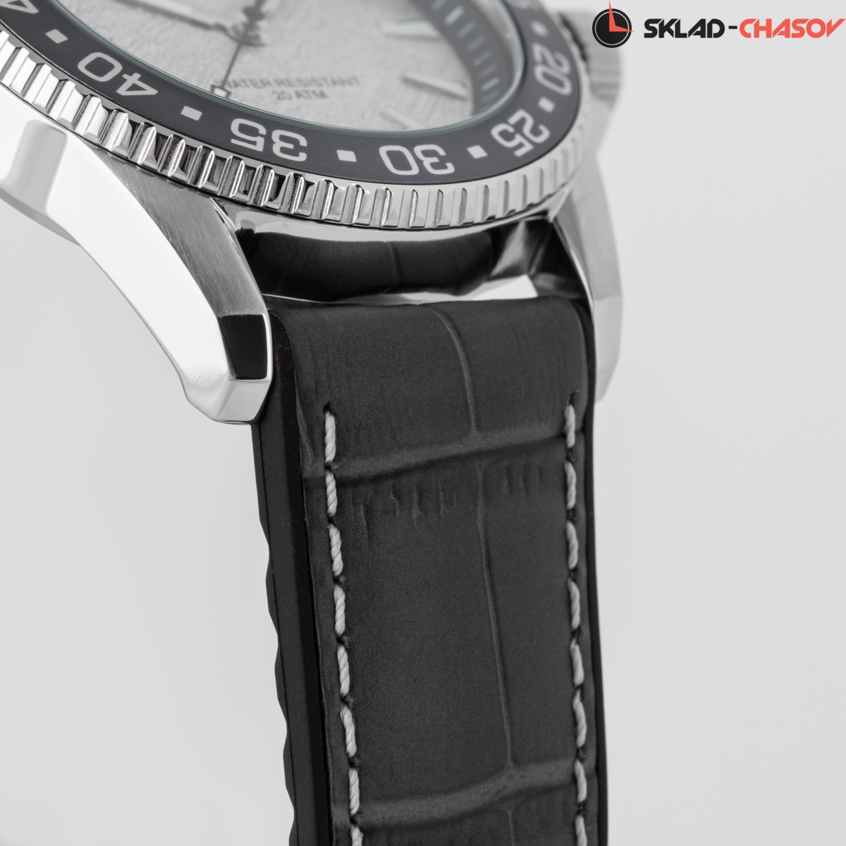 Спортивные часы с повышенной водостойкостью 20 атмосфер оснащены 41-миллиметровым корпусом из нержавеющей стали с широким безелем, на который вынесена дополнительная индикация секунд. Интересная текстура светло-серого циферблата делает его визуально более объемным и широким: здесь разместили крупные стрелки и накладные риски с люминесцентном покрытием. На 6 часах расположено окошко даты, выделенное полированной рамкой. Завинчивающаяся заводная головка окружена дополнительной защитой, которая предусмотрена в конструкции корпуса. В модели установлено ударопрочное минеральное стекло. Ремешок черного цвета состоит из двух частей: внутренняя сделана из силикона, материала, который не боится повышенной влажности, внешняя — из натуральной кожи. Такая комбинация имеет несколько преимуществ: ремешок соответствует спортивному характеру часов но, вместе с тем, подчеркивает их универсальность, позволяя сочетать аксессуар и с повседневной одеждой.