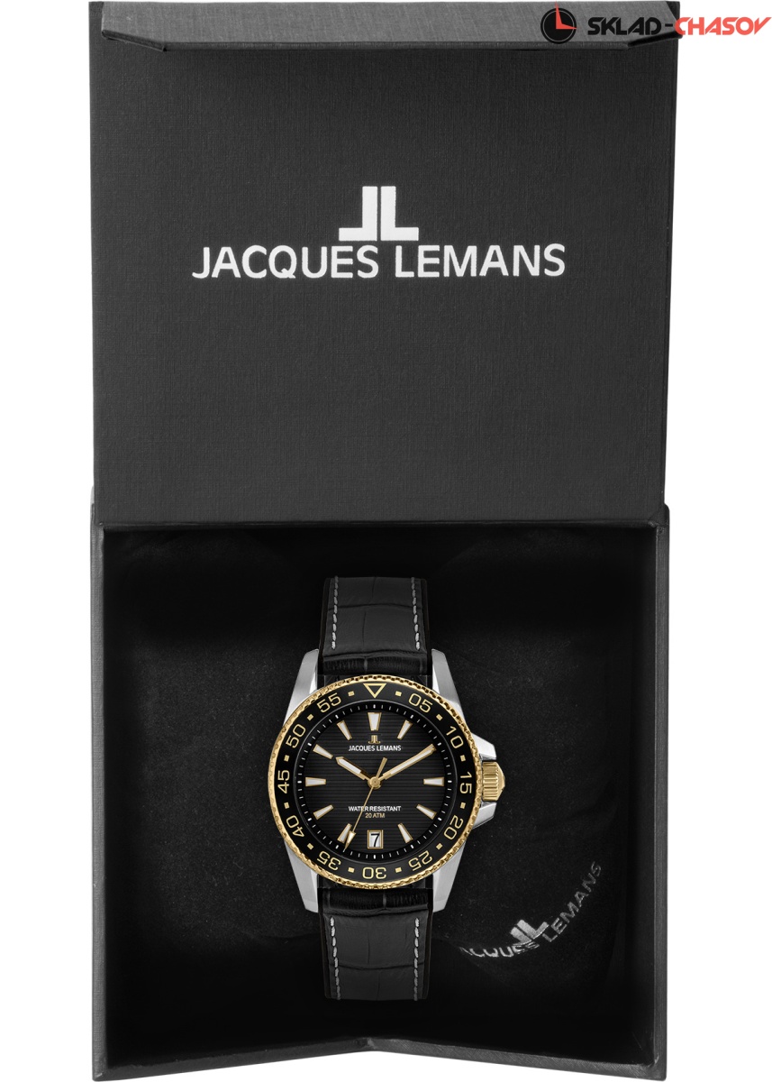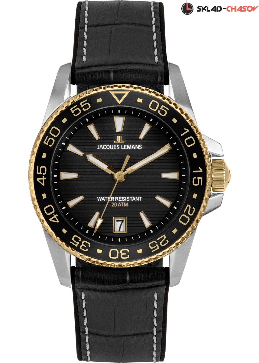 Спортивные часы с повышенной водостойкостью 20 атмосфер оснащены 41-миллиметровым корпусом из нержавеющей стали с широким безелем c PVD-покрытием из желтого золота, на который вынесена дополнительная индикация секунд. Горизонтальные полосы черного циферблата делают его визуально более широким: здесь разместили крупные стрелки и накладные риски с люминесцентном покрытием. На 6 часах расположено окошко даты, выделенное полированной рамкой. Завинчивающаяся заводная головка окружена дополнительной защитой, которая предусмотрена в конструкции корпуса. В модели установлено ударопрочное минеральное стекло. Ремешок черного цвета состоит из двух частей: внутренняя сделана из силикона, материала, который не боится повышенной влажности, внешняя — из натуральной кожи. Такая комбинация имеет несколько преимуществ: ремешок соответствует спортивному характеру часов но, вместе с тем, подчеркивает их универсальность, позволяя сочетать аксессуар и с повседневной одеждой.