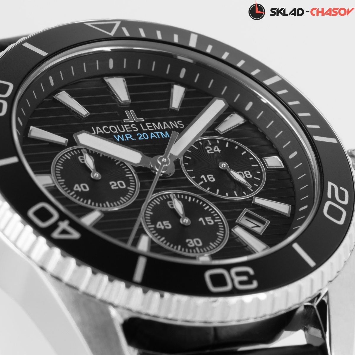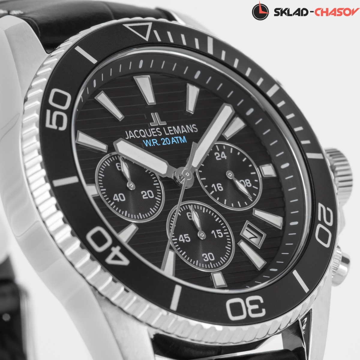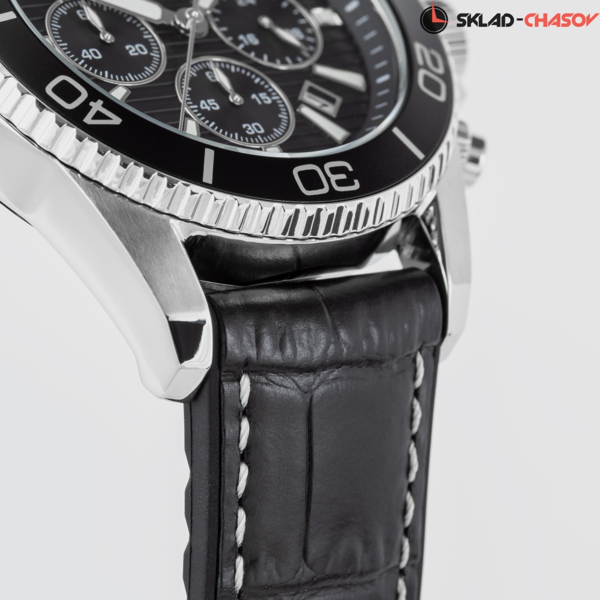 Спортивный хронограф с повышенной водостойкостью 20 атмосфер оснащен 44-миллиметровым корпусом из нержавеющей стали с широким безелем, на который вынесена дополнительная индикация секунд. Горизонтальные полосы черного циферблата делают его визуально более широким: здесь разместили крупные стрелки и накладные риски с люминесцентном покрытием. На 6 часах расположено окошко даты, выделенное полированной рамкой. Три дополнительных индикатора позволяют засекать время в минутах, секундах, определять время в формате 24-х часов. Завинчивающаяся заводная головка окружена дополнительной защитой, которая предусмотрена в конструкции корпуса. В модели установлено ударопрочное минеральное стекло. Ремешок черного цвета состоит из двух частей: внутренняя сделана из силикона, материала, который не боится повышенной влажности, внешняя — из натуральной кожи. Такая комбинация имеет несколько преимуществ: ремешок соответствует спортивному характеру часов но, вместе с тем, подчеркивает их универсальность, позволяя сочетать аксессуар и с повседневной одеждой.
