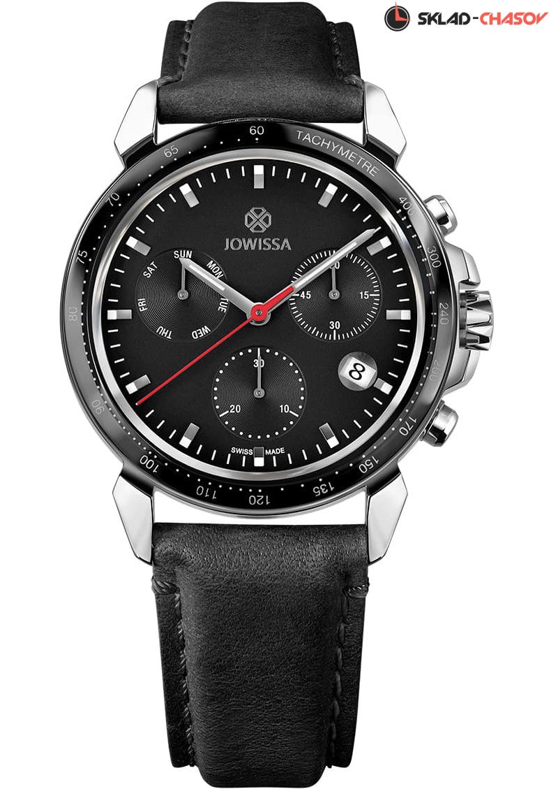 Мужские кварцевые часы, корпус из нержавеющей стали, ремешок из натуральной кожи, циферблат с хронографом и индикацией даты, тахиметр, сапфировое стекло, диаметр корпуса 42 мм, водозащитный корпус 5 АТМ (защита от брызг).