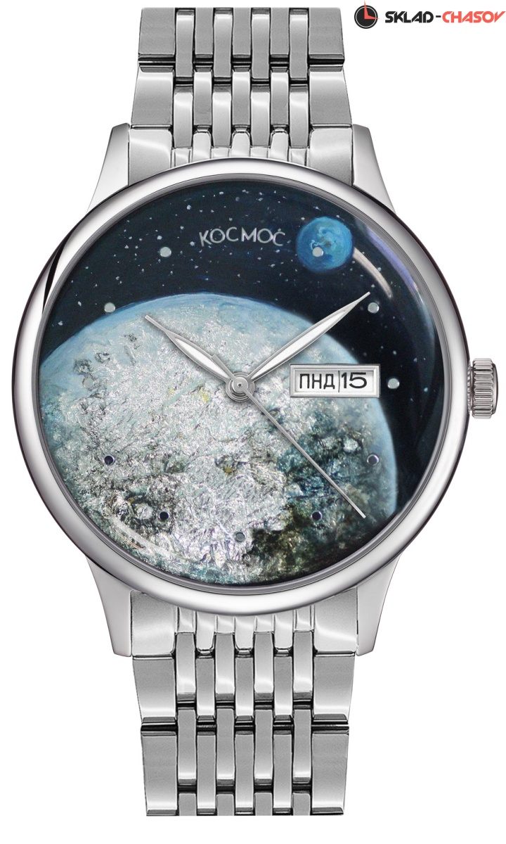 На основу было нанесено несколько слоев лака и краски - их чередование создает эффект объема и ощущение динамики. Для передачи неоднородности лунного грунта использовали тончайший лист серебряной фольги. Насыщенно-синий цвет фона передает бескрайность космического пространства и служит фоном россыпи ярких звезд. Детали прорисовываются постепенно, тончайшей кистью: на один сюжет требуется до 50 часов работы. Процесс запекания миниатюры в специальной печи придет рисунку необходимый блеск и завершенность. Часы созданы в единственном экземпляре. В часах установлен механизм TMI с функцией автоподзавода. Кроме часов, минут и секунд здесь предусмотрены дата и день недели. Их индикатор, выделенный накладной рамкой, вы найдете в позиции «3 часа». За движением деталей механизма можно наблюдать, стоит только перевернуть часы: задняя крышка прозрачна. Часовая и минутная стрелка покрыты люминесцентным составом, который светится в темноте. Минеральное стекло сделано по технологии, характерной для 60-70-х годов прошлого века: оно выпуклое с обеих сторон. Браслет часов выполнен из гипоаллергенной нержавеющей стали с зеркальной полировкой.