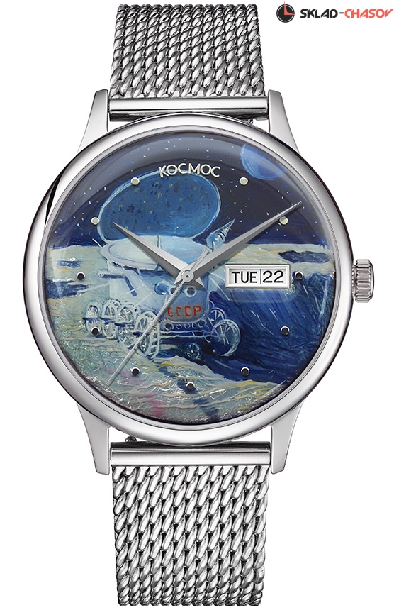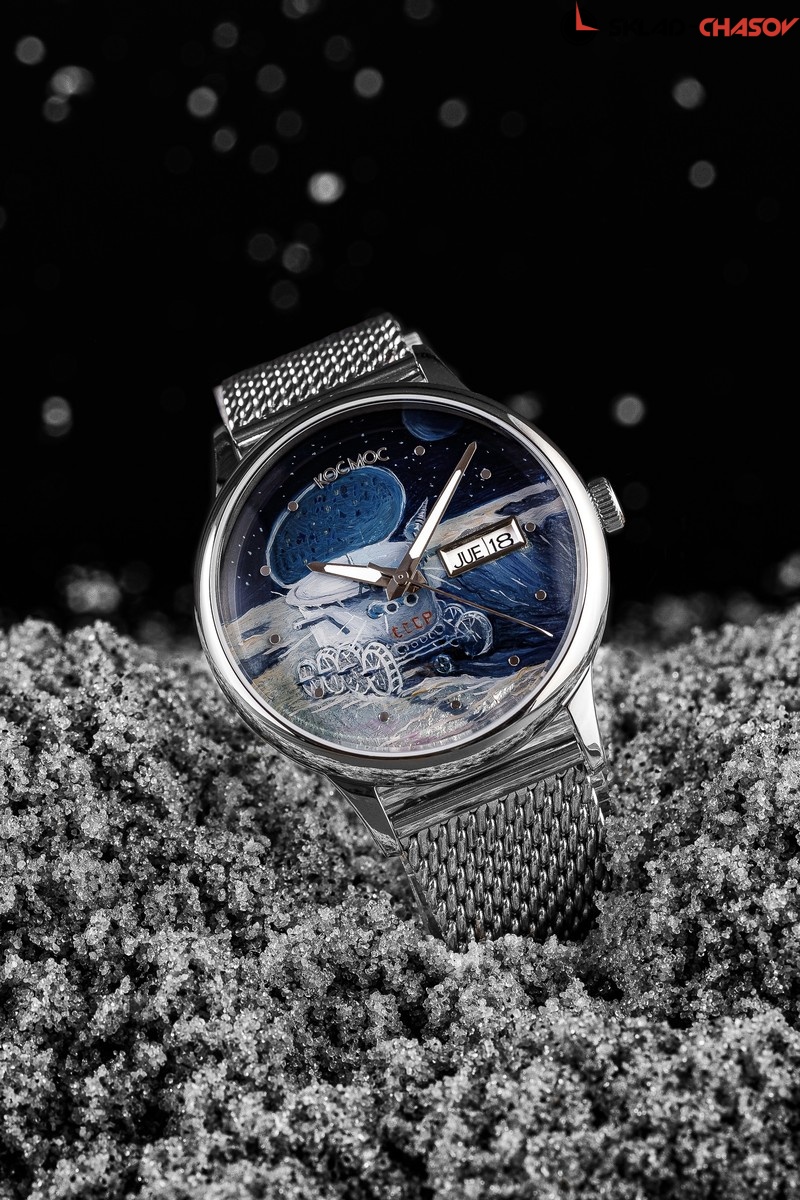 Художники бренда Космос, чтобы передать необычный рельеф Луны, использовали тончайший лист серебряной фольги. Для создания модели серии Уникальные часы художники бренда выбрали технику лаковой миниатюры. На основу наносится несколько слоев лака и краски, их чередование создает эффект объема и ощущение динамики. Постепенно прорисовываются детали: на один сюжет требуется до 50 часов работы. Процесс запекания миниатюры в специальной печи придает рисунку необходимый блеск и завершенность. Часы созданы в единственном экземпляре. В часах установлен механизм TMI с функцией автоподзавода. Кроме часов, минут и секунд здесь предусмотрены дата и день недели. Их индикатор, выделенный накладной рамкой, вы найдете в позиции «3 часа». За движением деталей механизма можно наблюдать, стоит только перевернуть часы: задняя крышка прозрачна. Часовая и минутная стрелка покрыты люминесцентным составом, который светится в темноте. Минеральное стекло сделано по технологии, характерной для 60-70-х годов прошлого века: оно выпуклое с обеих сторон. Нити из нержавеющей стали в браслете складываются в особое плетение, названное «миланским». Оно придает браслету гибкости, сохраняя прочность. Специальная застежка позволяет легко регулировать длину браслета самостоятельно.
