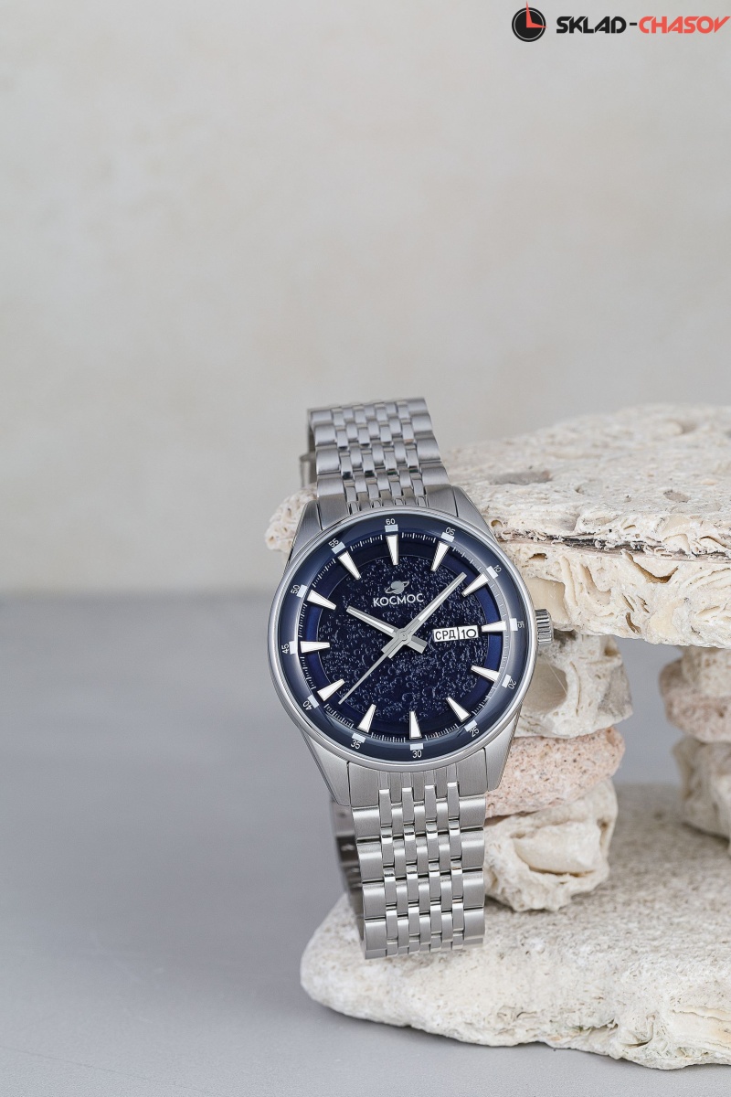 Объемный циферблат темно-синего цвета состоит из двух уровней. В центре первого (с имитацией поверхности Луны) движутся крупные стрелки, часовая и минутная с люминесцентным покрытием. Второй уровень декорирован круговым брашингом. На нем закреплены индексы, которые, как и стрелки будут хорошо читаться даже в темноте. Сдвоенный индикатор даты и дня недели расположен на 3 часах (текущий день недели может демонстрироваться на двух языках, русском и английском).