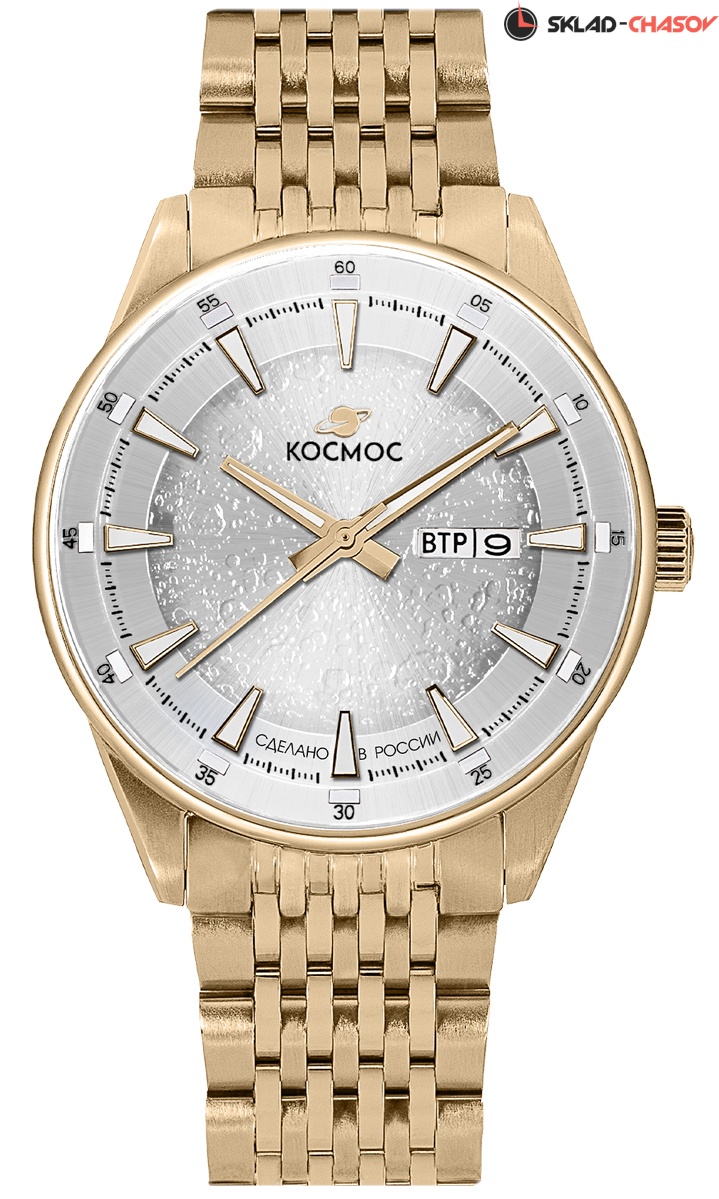 Объемный циферблат белого цвета состоит из двух уровней. В центре первого (с имитацией поверхности Луны) движутся крупные стрелки, часовая и минутная с люминесцентным покрытием. Второй уровень декорирован круговым брашингом. На нем закреплены индексы, которые, как и стрелки будут хорошо читаться даже в темноте. Сдвоенный индикатор даты и дня недели расположен на 3 часах (текущий день недели может демонстрироваться на двух языках, русском и английском).