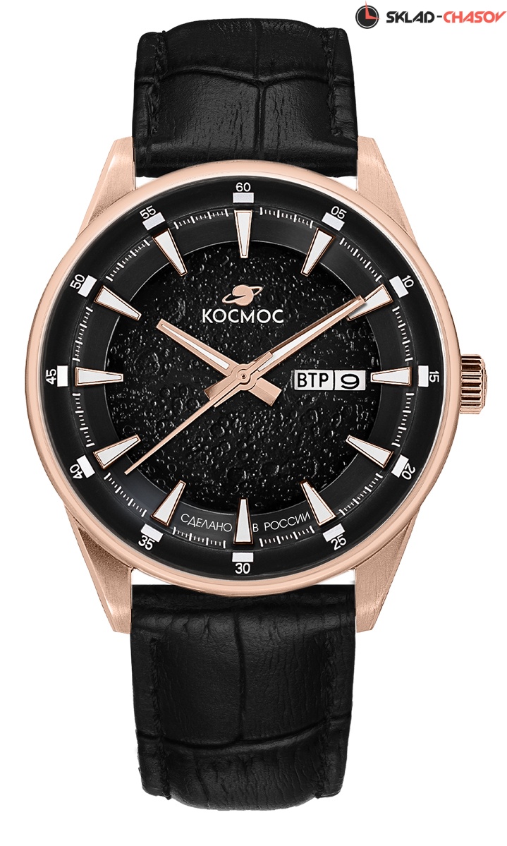 Объемный циферблат черного цвета состоит из двух уровней. В центре первого (с имитацией поверхности Луны) движутся крупные стрелки, часовая и минутная с люминесцентным покрытием. Второй уровень декорирован круговым брашингом. На нем закреплены индексы, которые, как и стрелки будут хорошо читаться даже в темноте. Сдвоенный индикатор даты и дня недели расположен на 3 часах (текущий день недели может демонстрироваться на двух языках, русском и английском).